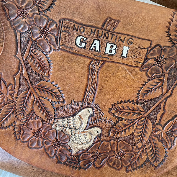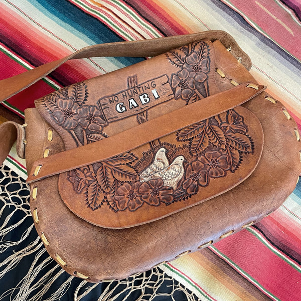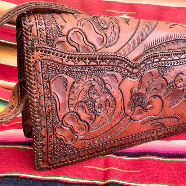 Vintage 60s OOAK Tooled Leather Shoulder Bag, Horses & Birds Heavily Detailed