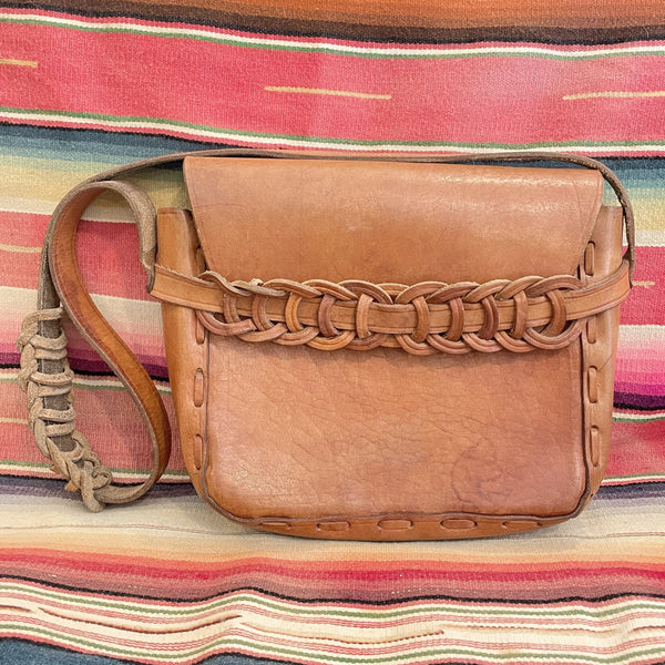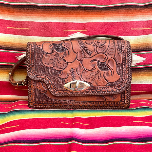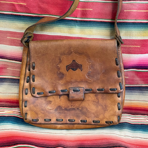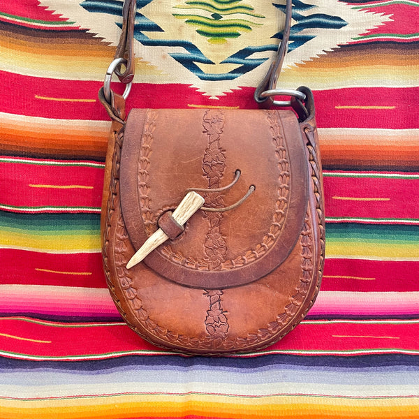 Vintage Tooled Leather Southwestern Shoulder Bag w/Horn Closure, 60s/70s Hippie Bag