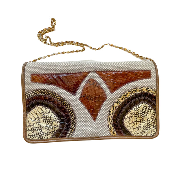 Caprice Vintage 70s Cream/Brown genuine Snakeskin Clutch Bag + Metal Strap