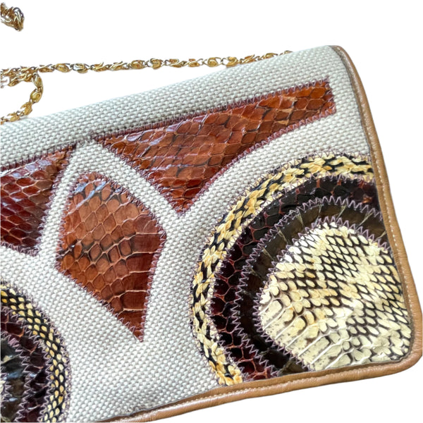 Vintage Cloth/Genuine Snakeskin Applique Clutch Handbag + Metal Strap