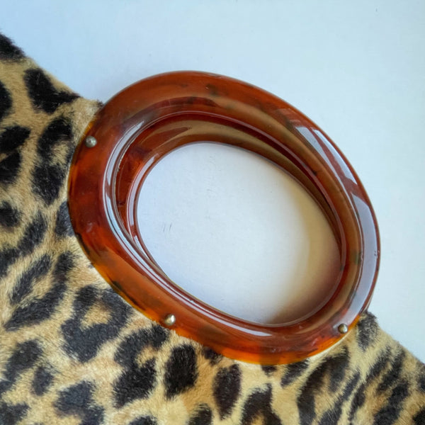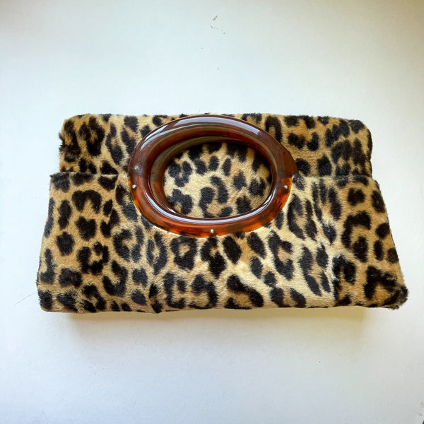 SOLD Vintage 60s Faux Leopard Fabric Clutch Bag Lucite Handles