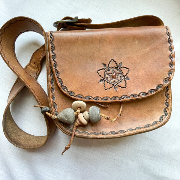 Vintage Tooled Leather Southwestern Shoulder Bag w/Ceramic Beads