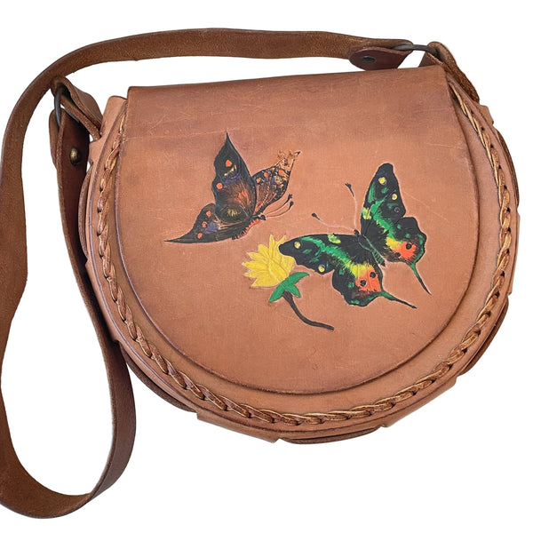 Vintage Hand Tooled Leather Hand Painted Handbag, Butterflies, OOAK