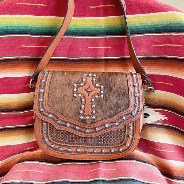 Vintage Tooled Leather Cowhide Shoulder Bag, Metal Studded Southwestern Bag