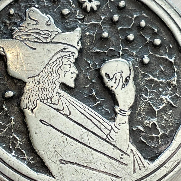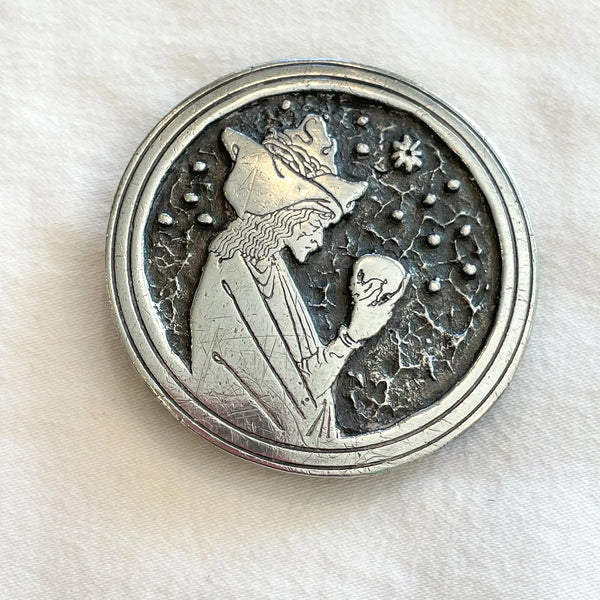 SOLD Vintage 70s Indiana Metal Craft Aubrey Beardsley Sorcerer Skull Belt Buckle, Silver Tone
