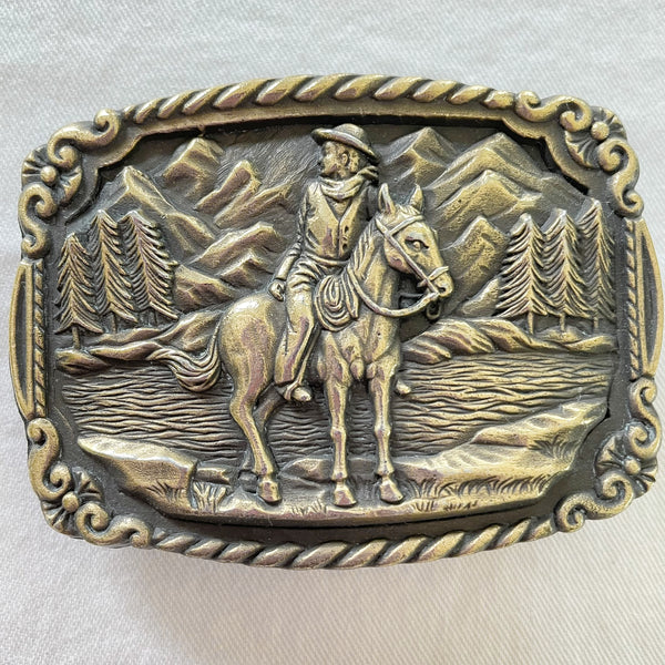 Vintage Brass Belt Buckle, Cowboy on Horse, Western/Southwestern Theme 3 1/8" L