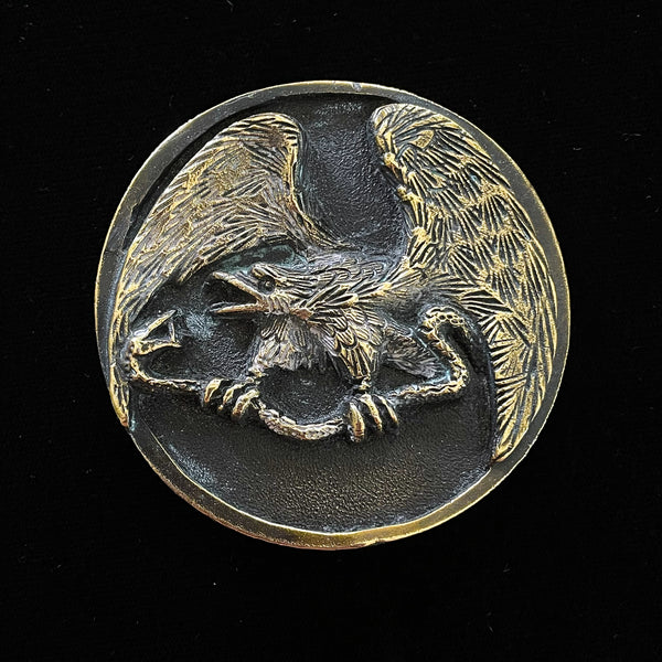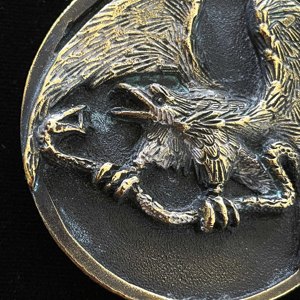 JR Cray Vintage 70s Brass Eagle/Snake Belt Buckle, Indiana Metal Craft 2 3/4" Dia