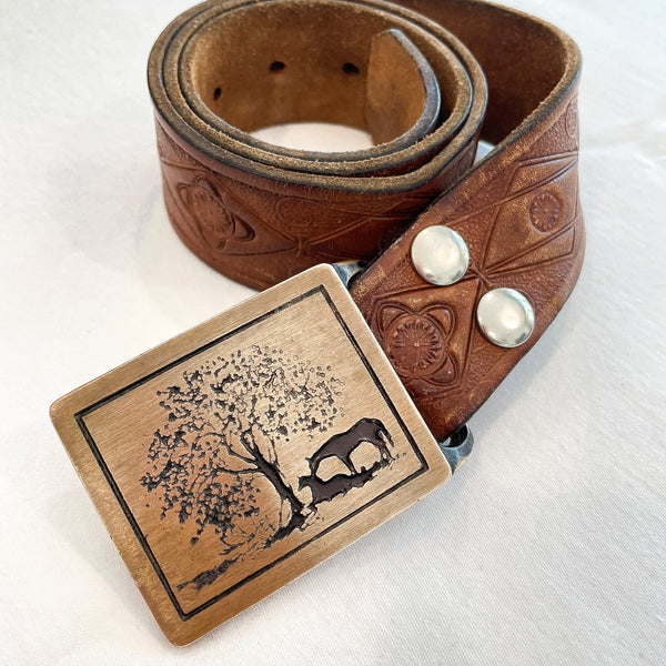 Vintage 70s Tech Ether Guild 2 Horses Belt Buckle on Tooled Leather Belt, Fits SZ 28-32"