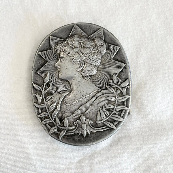 Bergamot Brass Works Vintage 70s Solid Brass Belt Buckle, Victorian Woman Pewter
