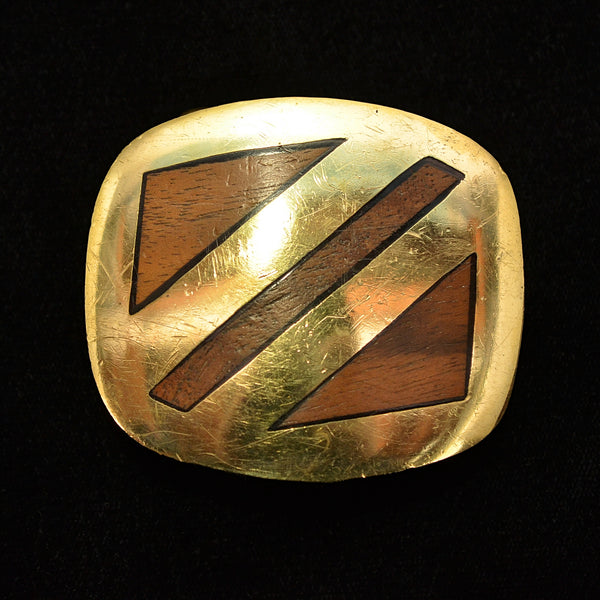 SOLD Vintage 70s Trinity Solid Brass Belt Buckle with Inlaid Wood, 117 Grams