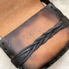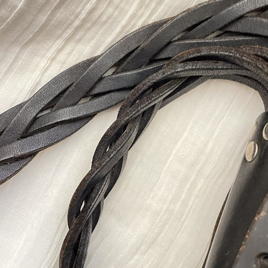 Leather lacing on the sides, braided leather strap. No interior pockets.