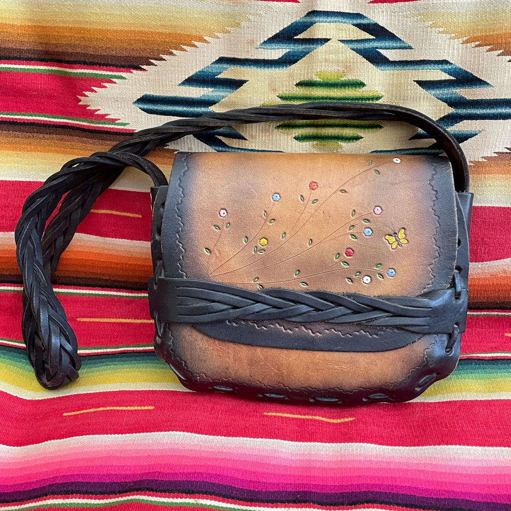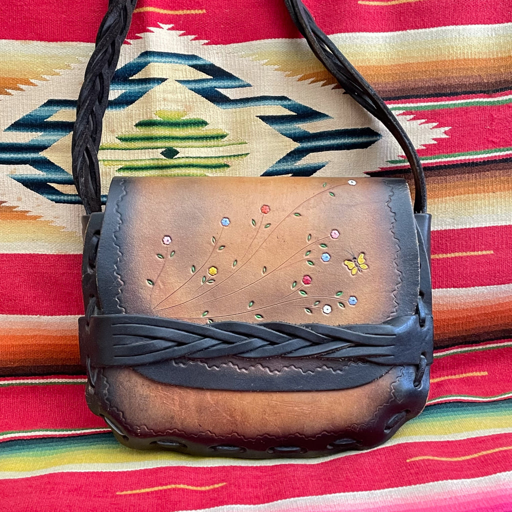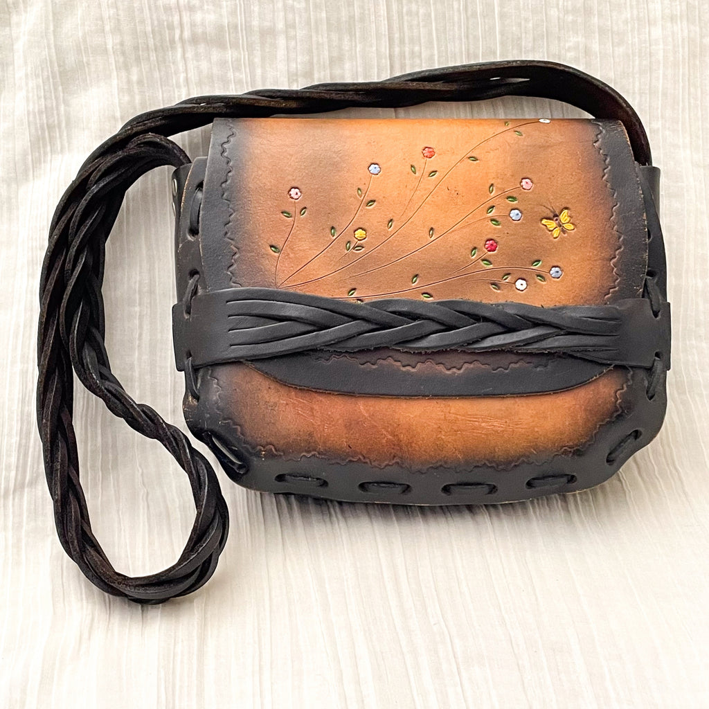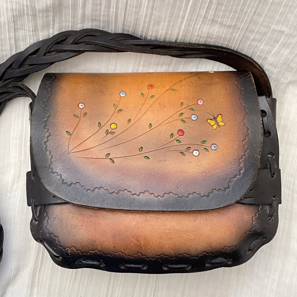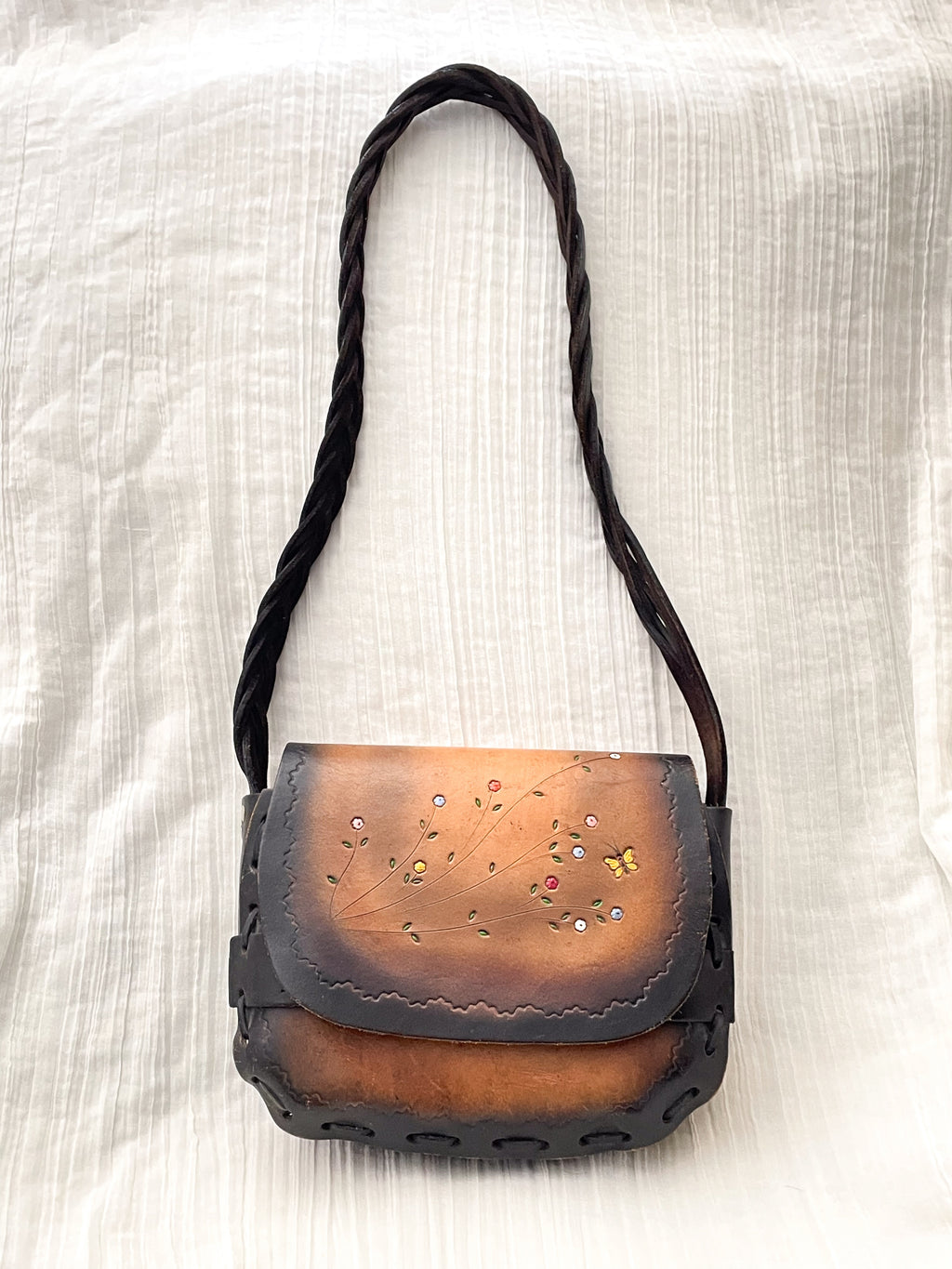Vintage 90s/Y2K Tooled/Painted Flower/Butterfly Bag Hippie Shoulder Bag
