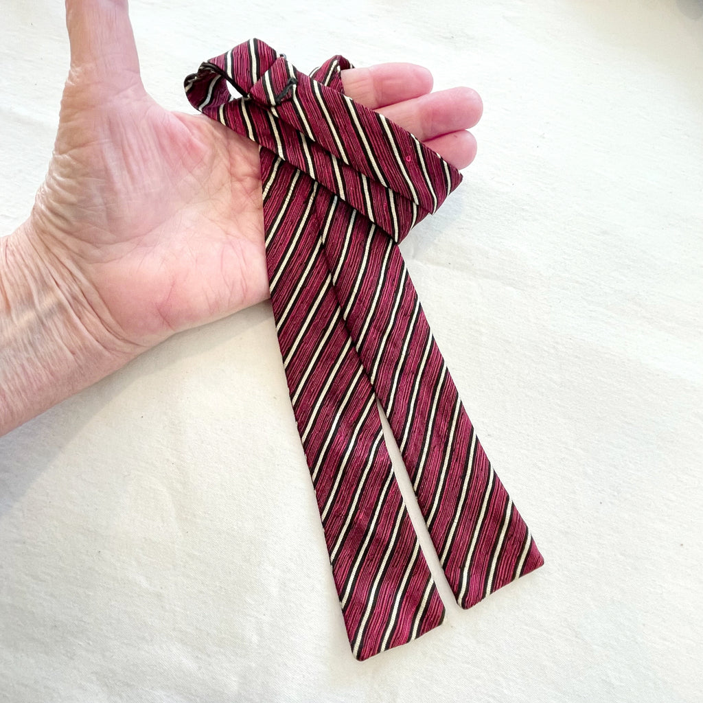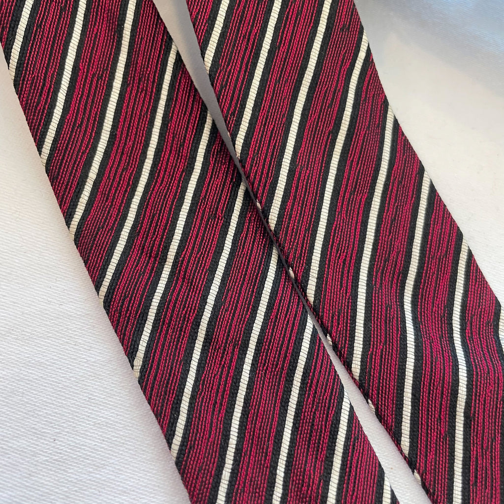Vintage MCM red, black, white diagonal striped bowtie, tiny, striated stripes.