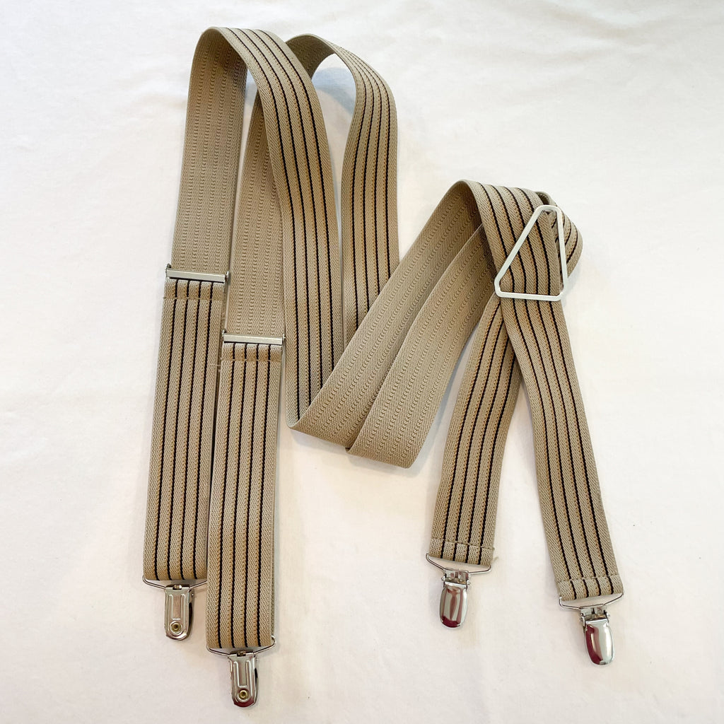 Vintage striped suspenders, tan with dark brown stripe. Silver tone metal clips.
