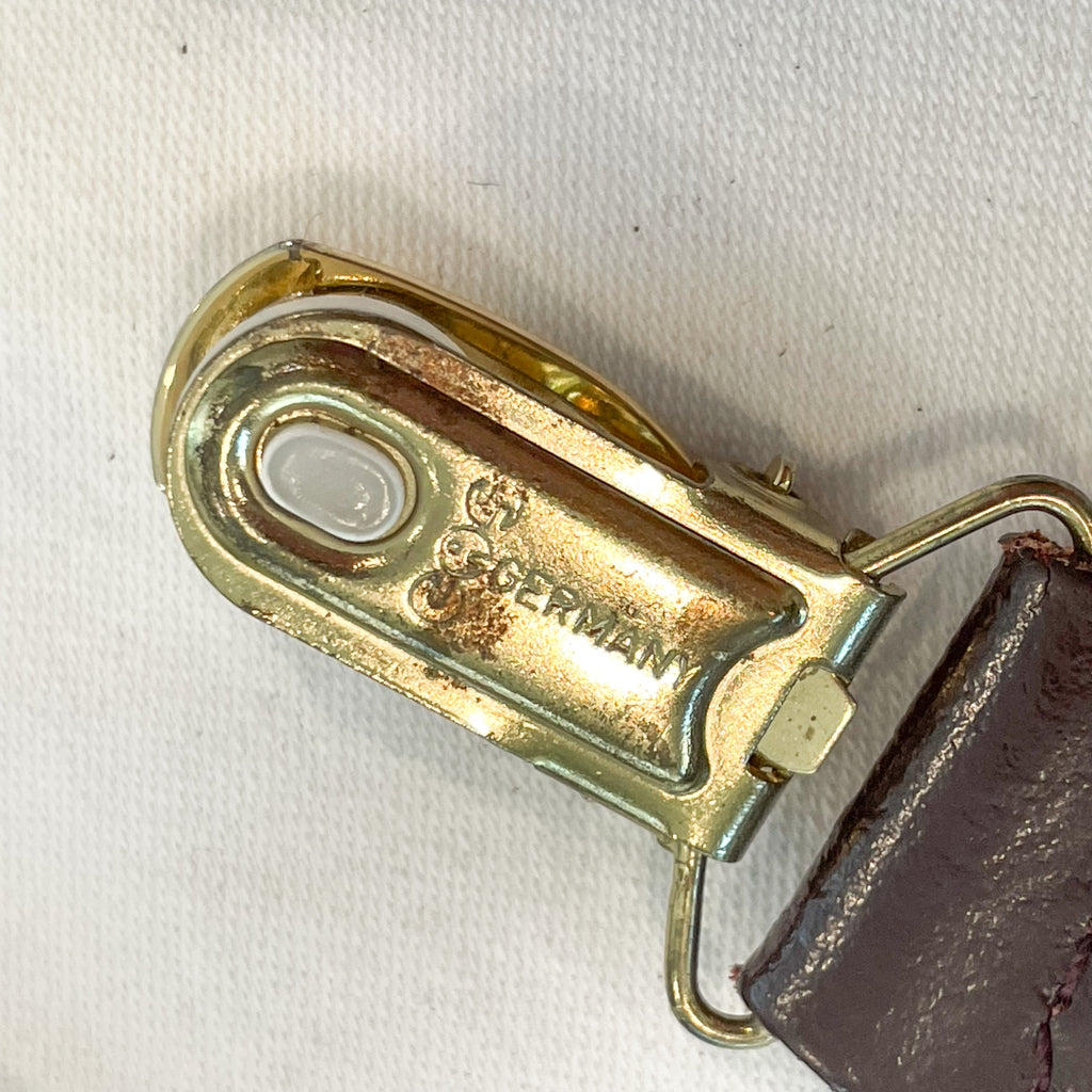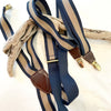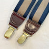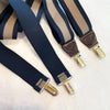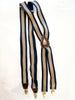 SOLD CAS Germany Vintage Striped Suspenders, Navy Taupe Elastic Suspenders, Brass Hardware