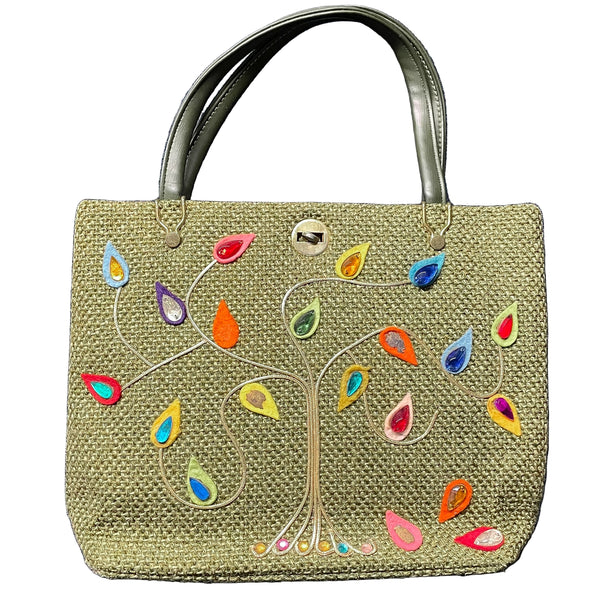 Vintage 60s Bejeweled Olive Green Burlap Handbag, Top Handle Purse
