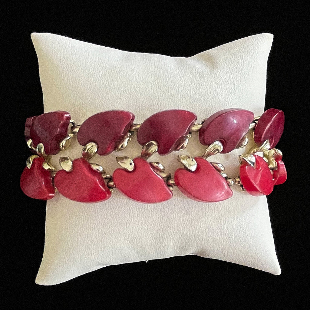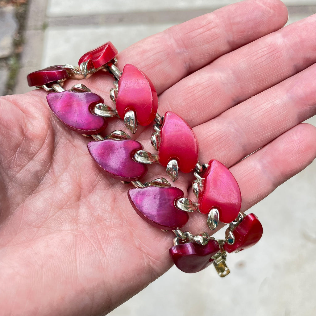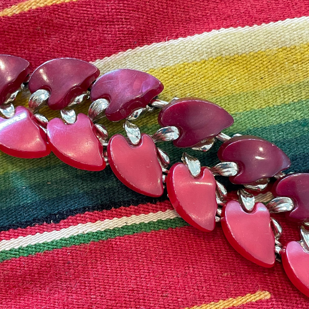 Vintage 50s Thermoset Lucite bracelet, 2 rows of moderne leaf shaped beads.