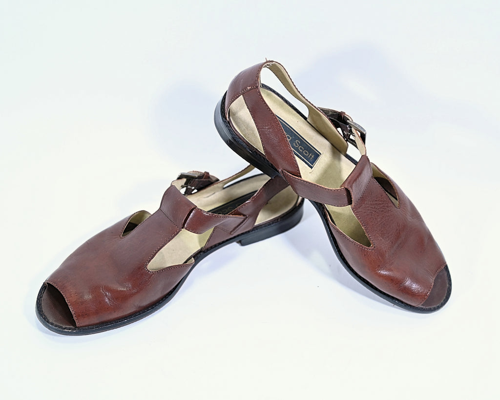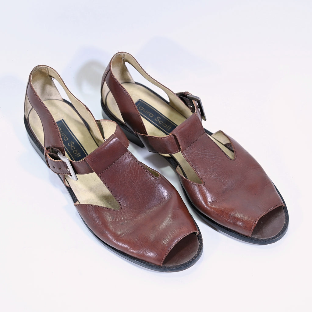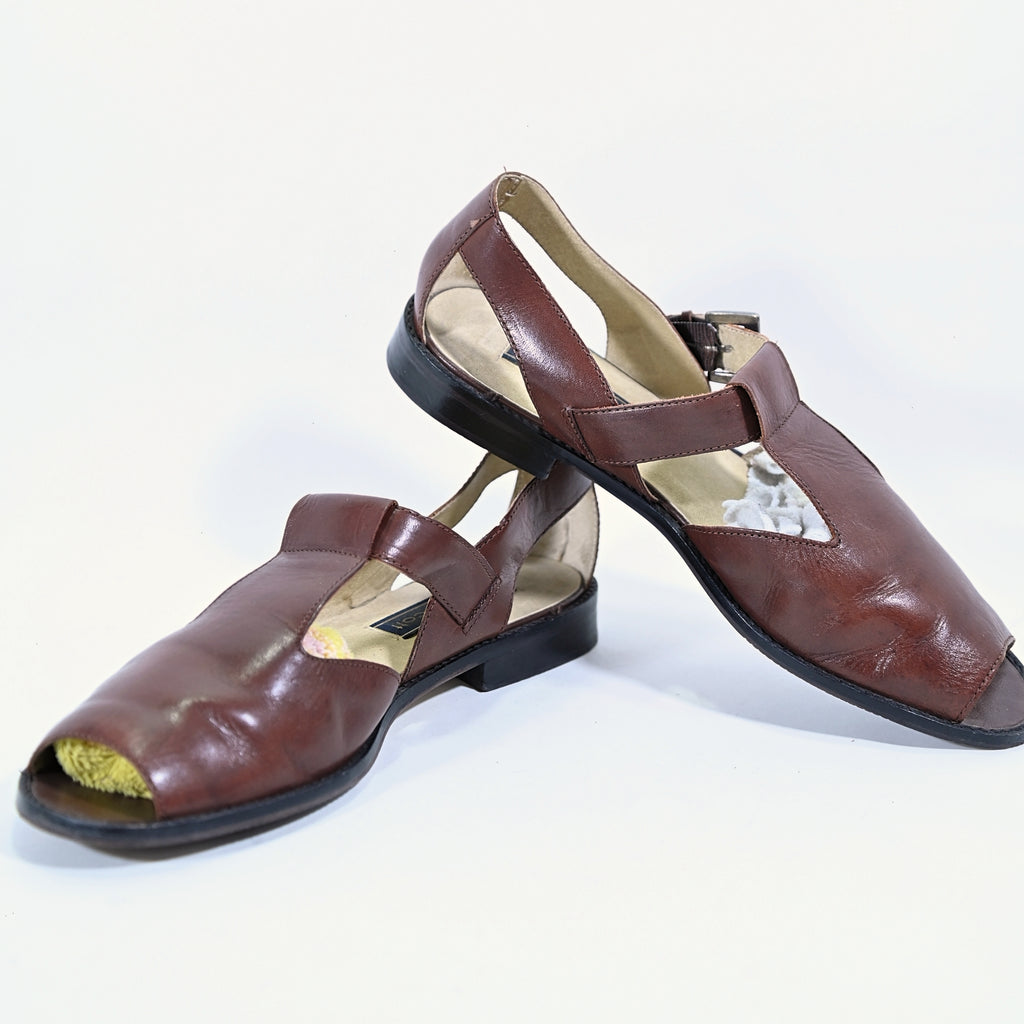 90s brown leather fisherman style shoes with a peep toe and strap with buckle closure.