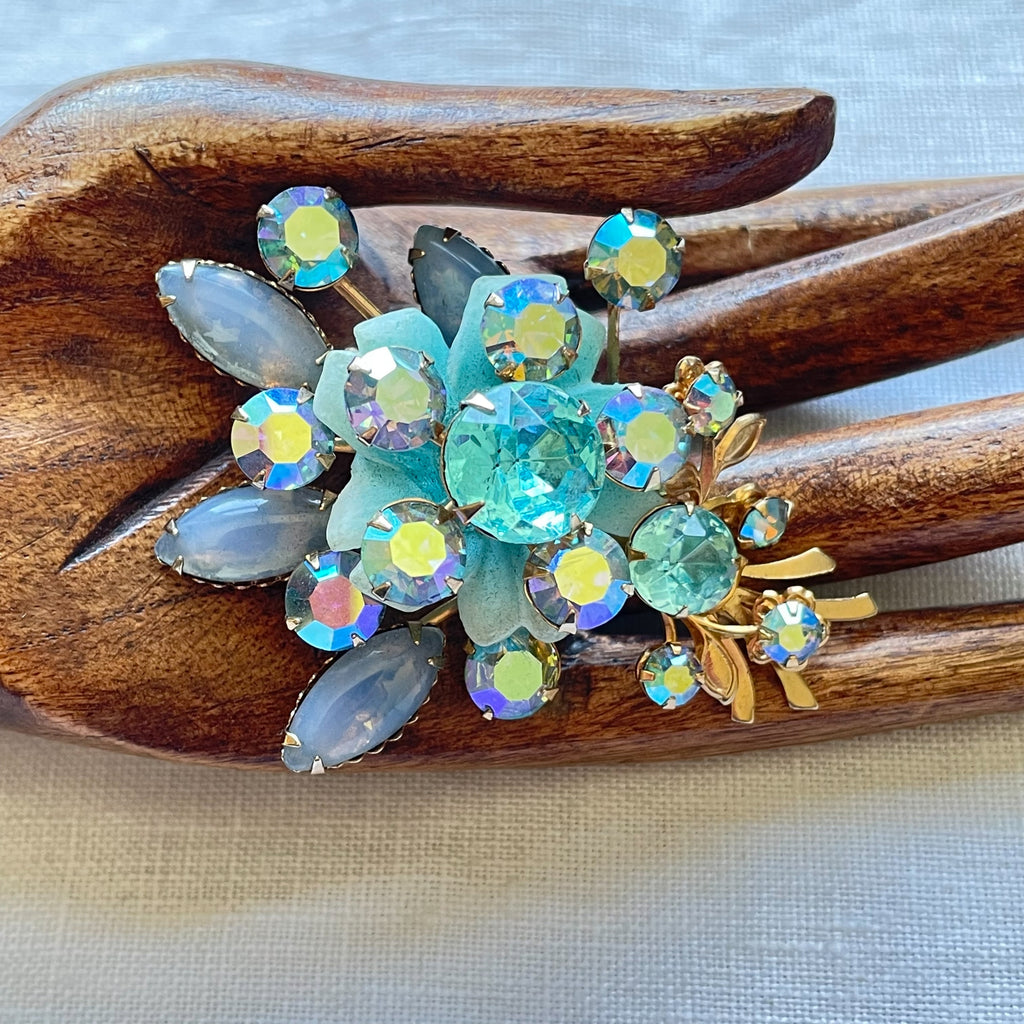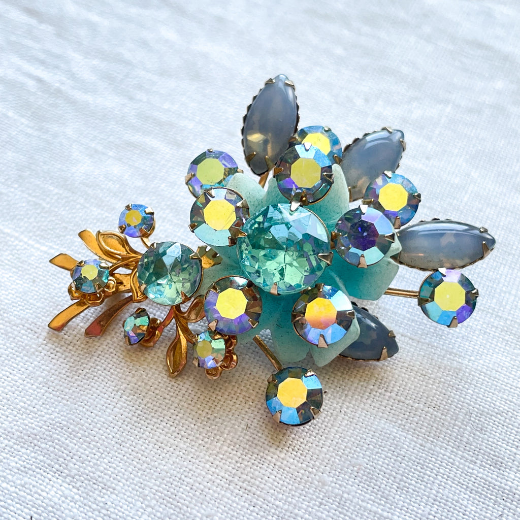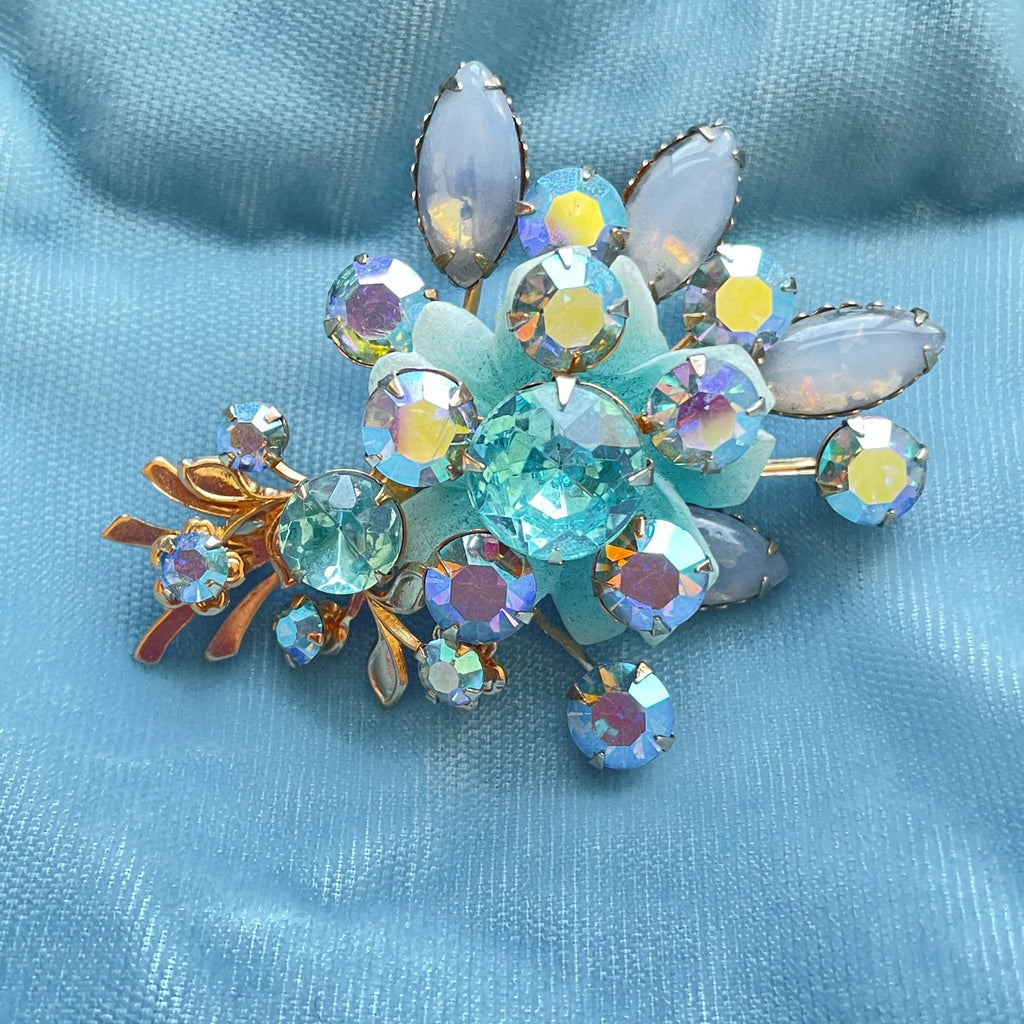 Vintage Aqua Rhinestone + Aurora Borealis Brooch, Gold Tone MCM Pin