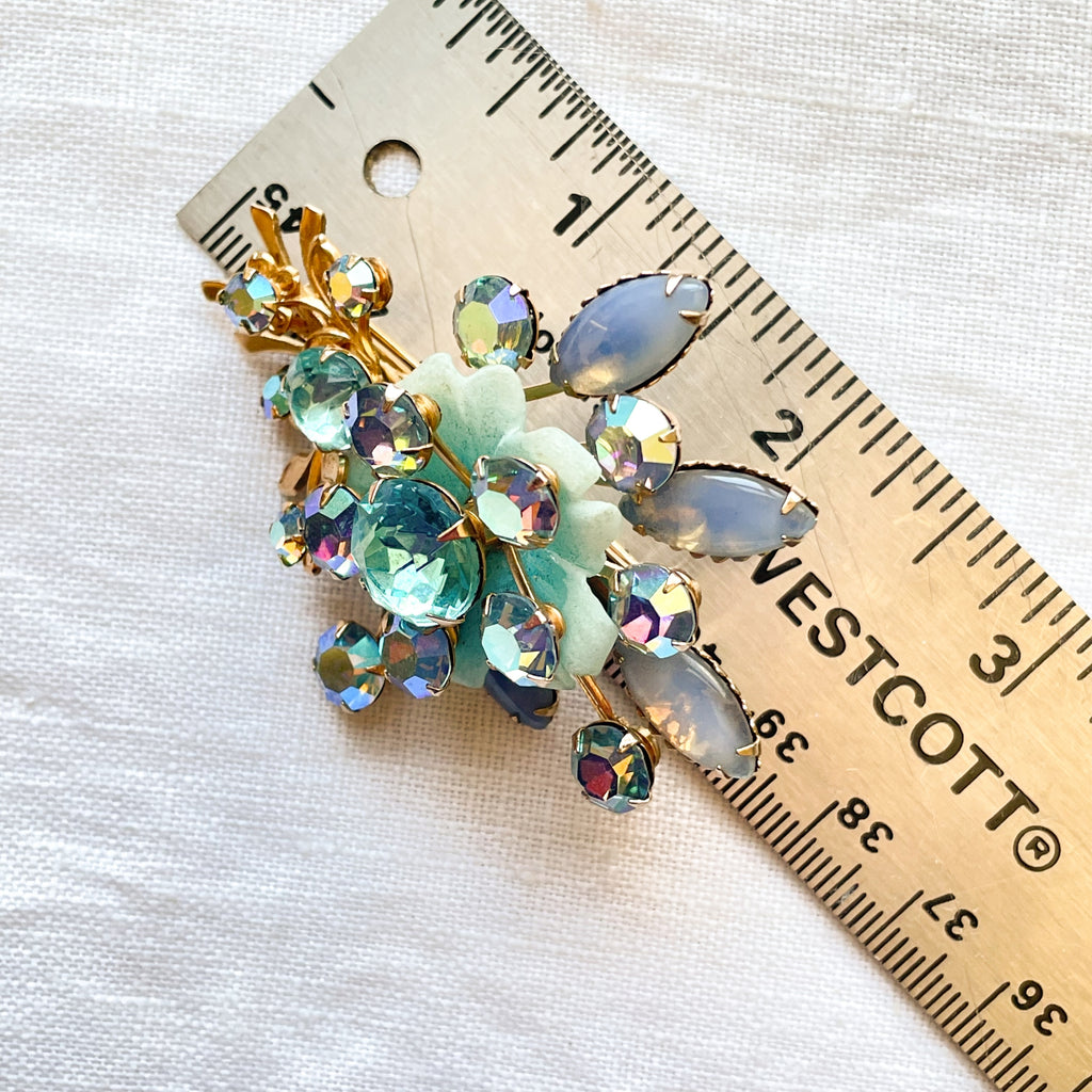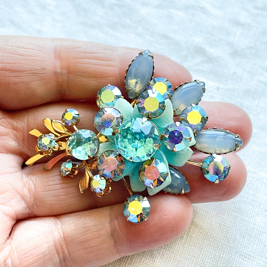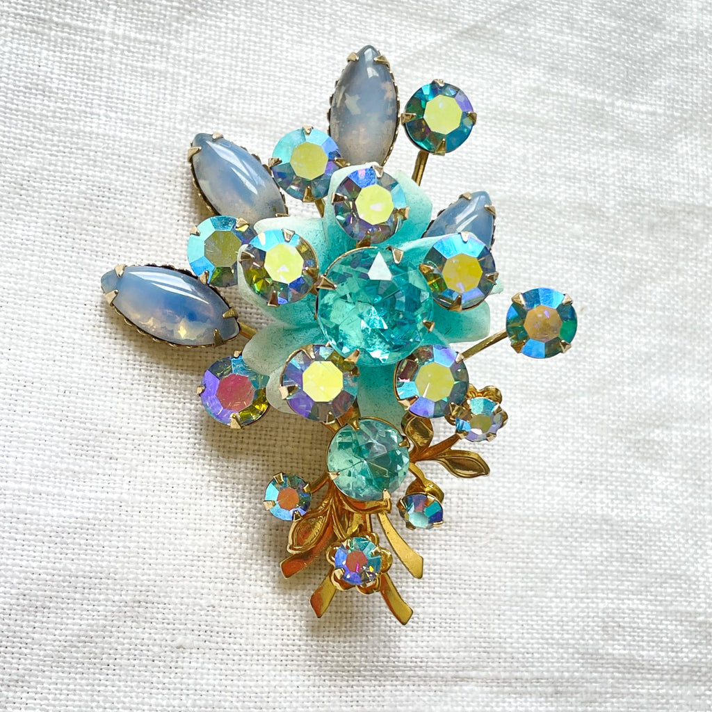 Vintage Aqua Rhinestone + Aurora Borealis Brooch, Gold Tone MCM Pin