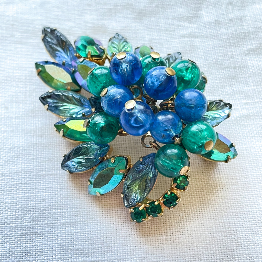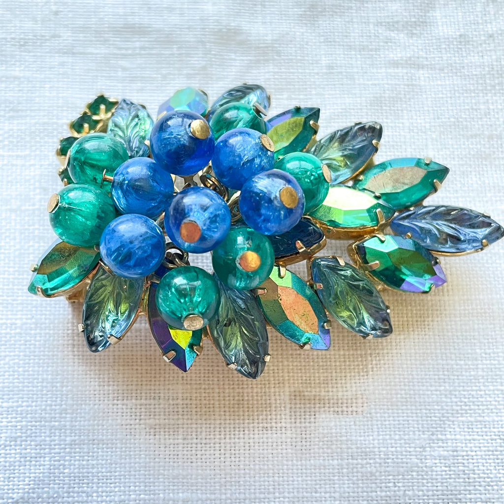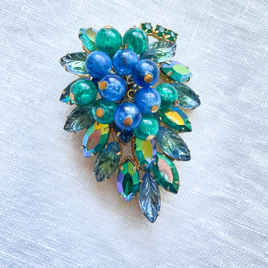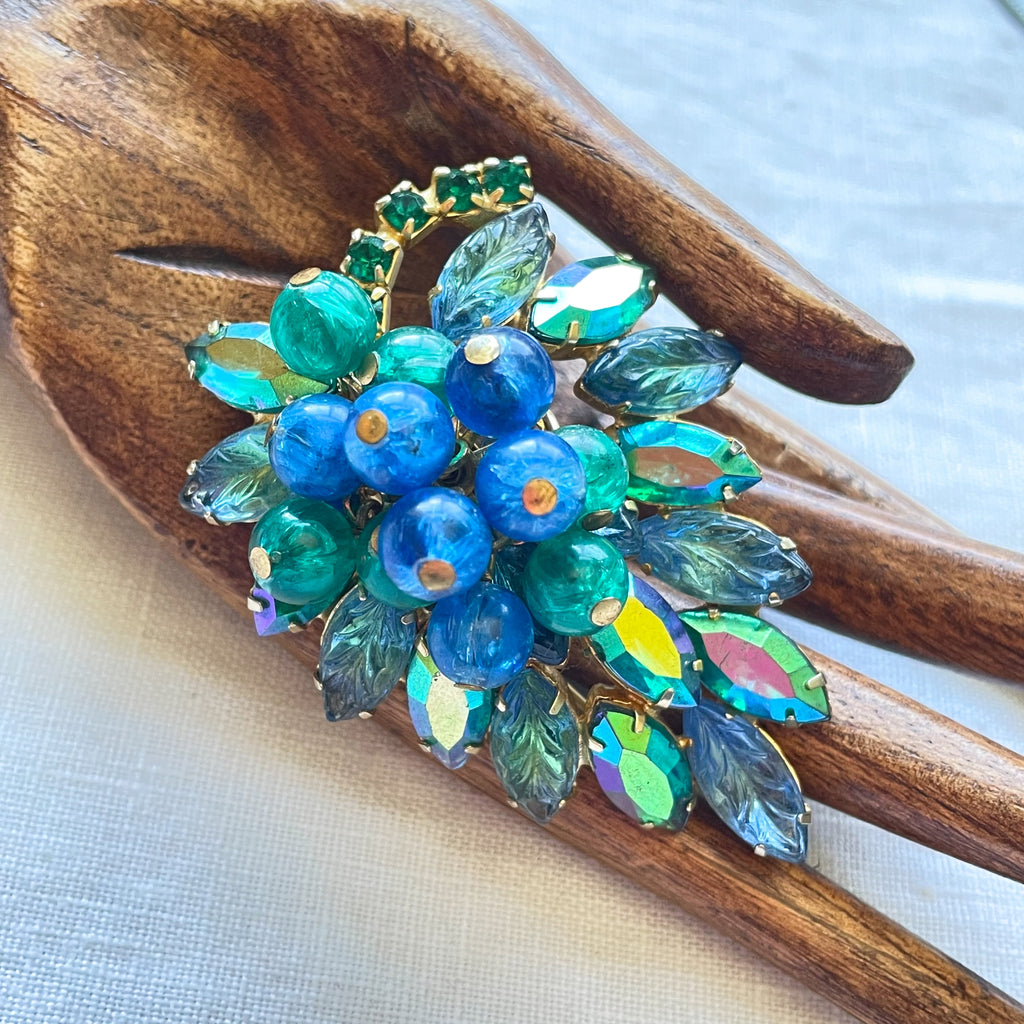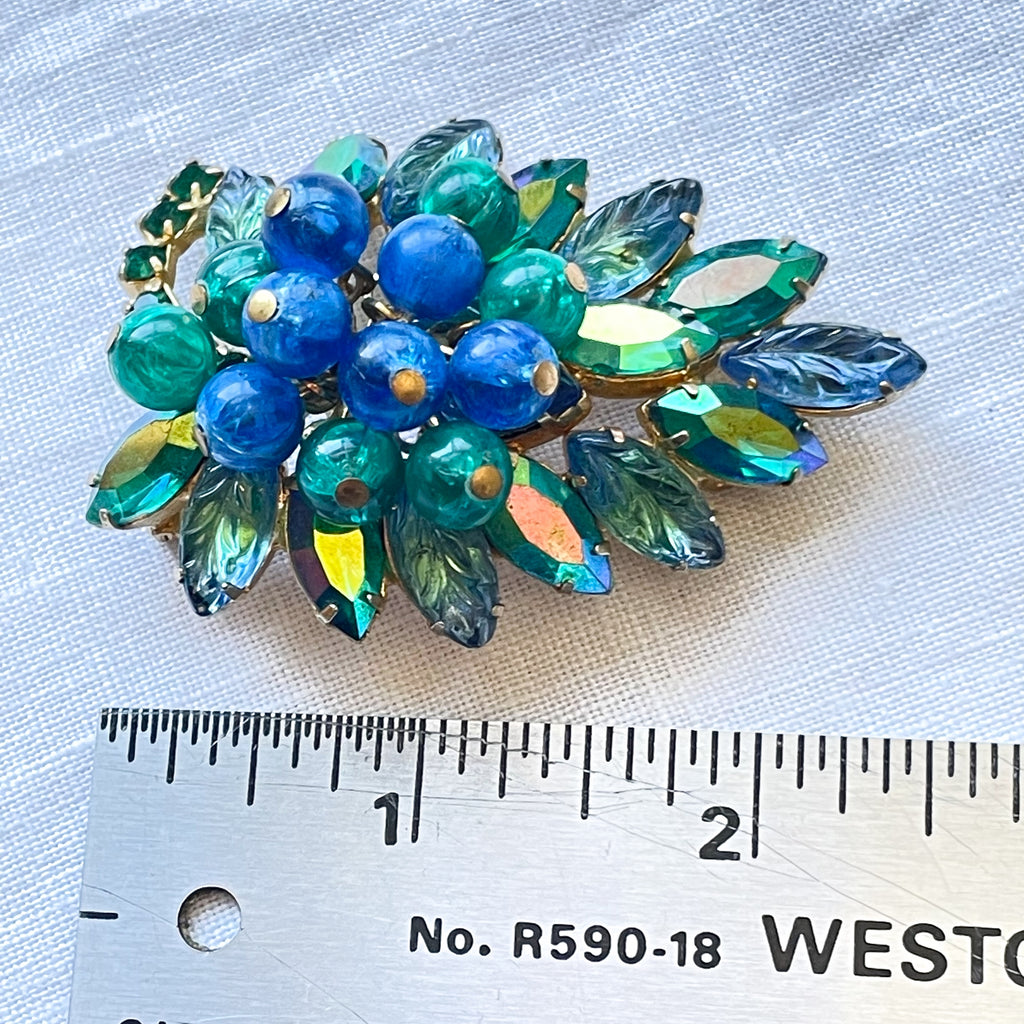 Vintage MCM Aqua/Blue Rhinestone Brooch, Aurora Borealis Marquis Stones