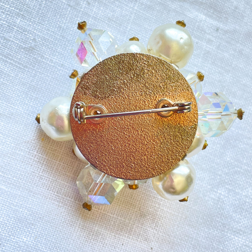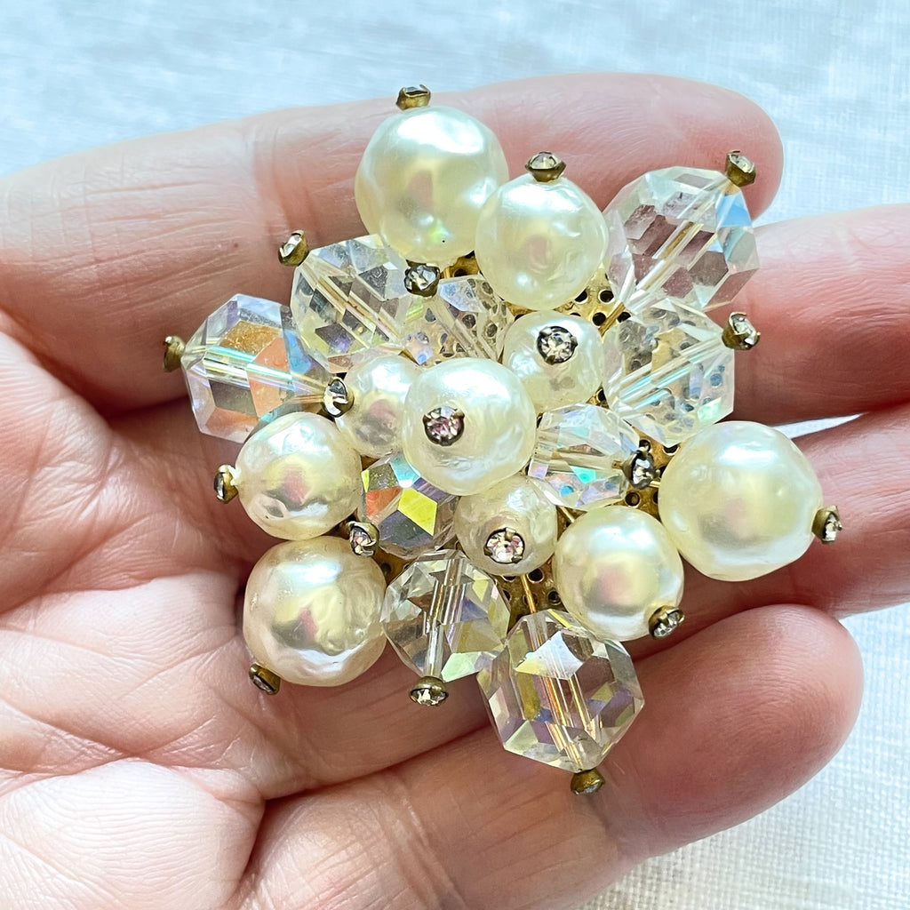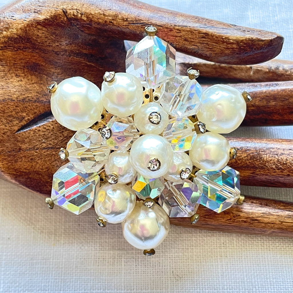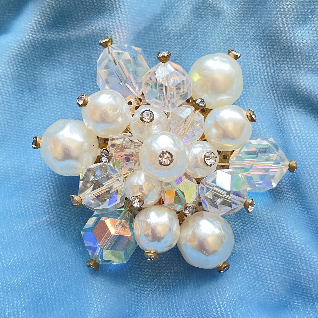 Vintage faux pearls, aurora borealis brooch with tiny rhinestone accents.