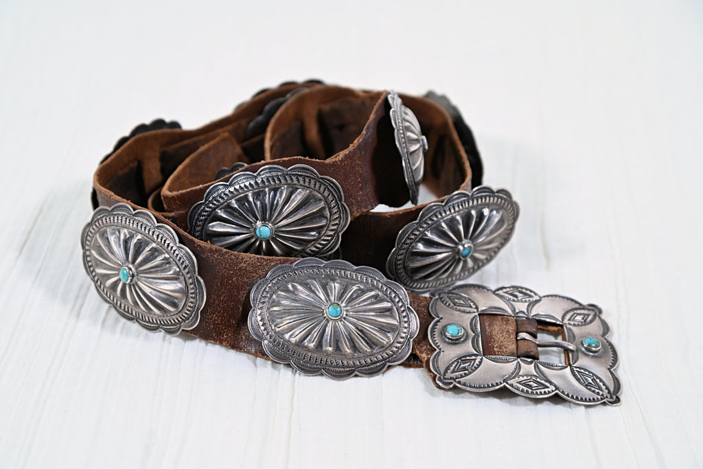 Beautiful 1930s Navajo Leather, Silver, and Turquoise Concho Belt. Almost 100 years old!