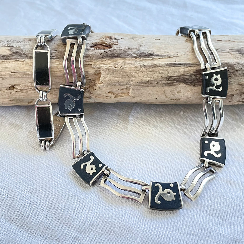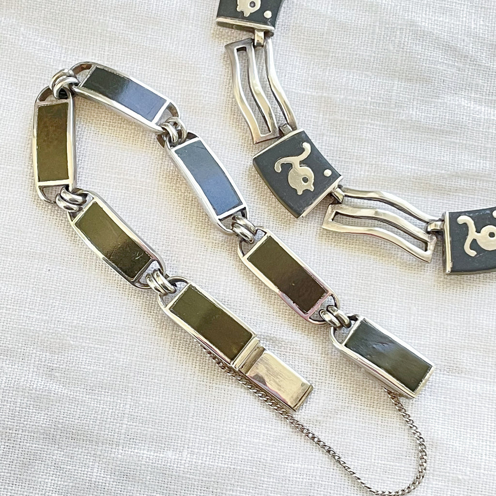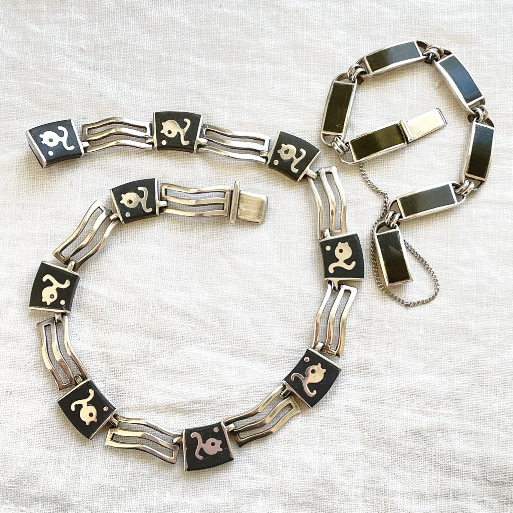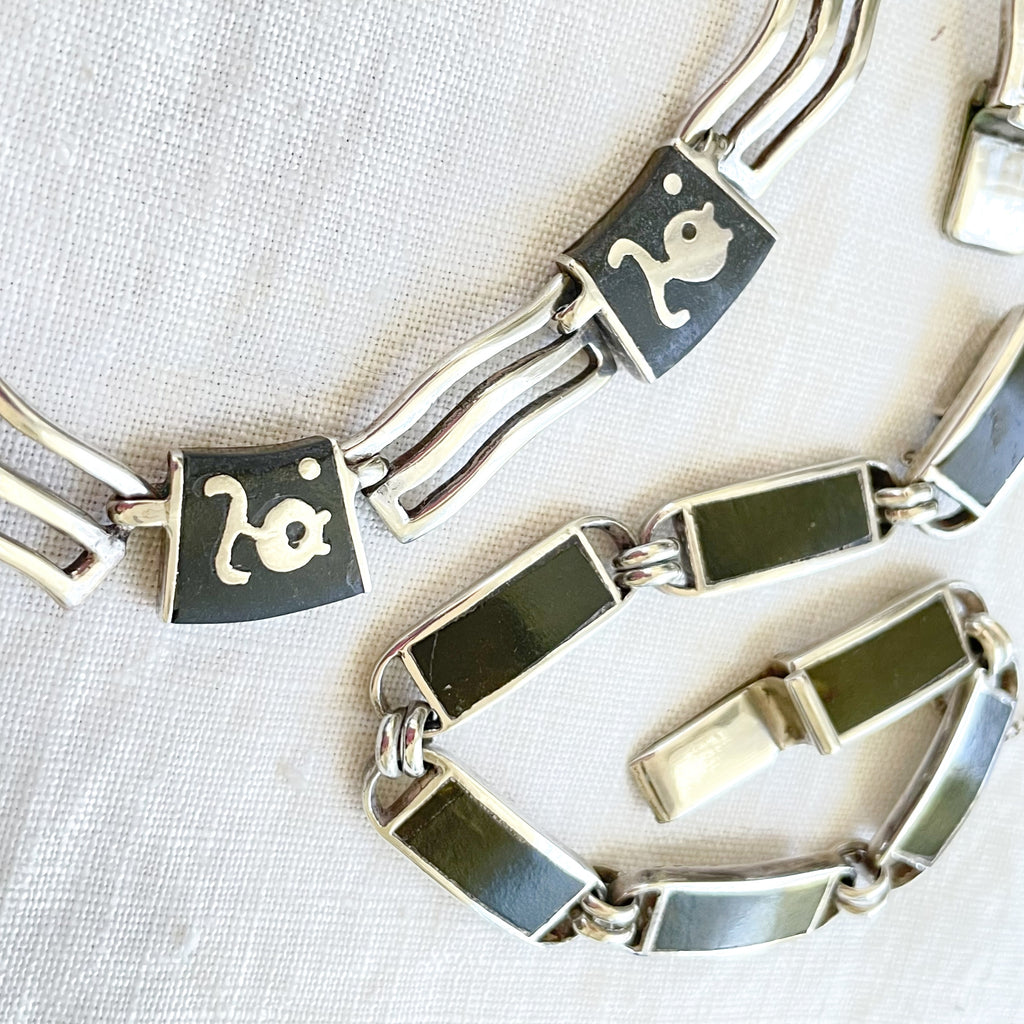 A group of Los Castillo "Onix Negro" onyx stone inlay jewelry including a necklace and bracelet.