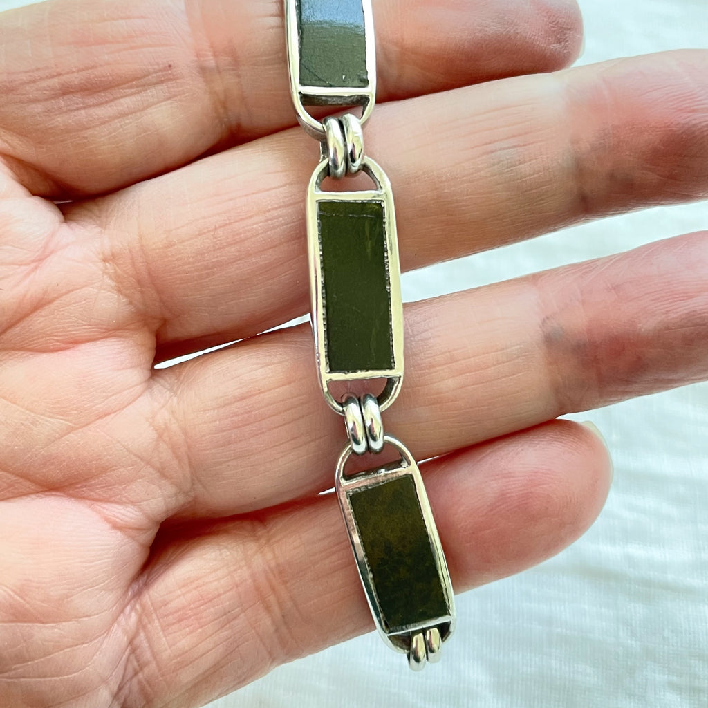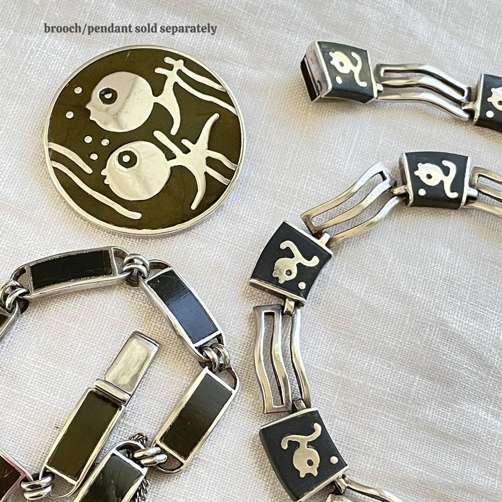 Fish design on the necklace, bracelet is a simple modernist design inset in silver.