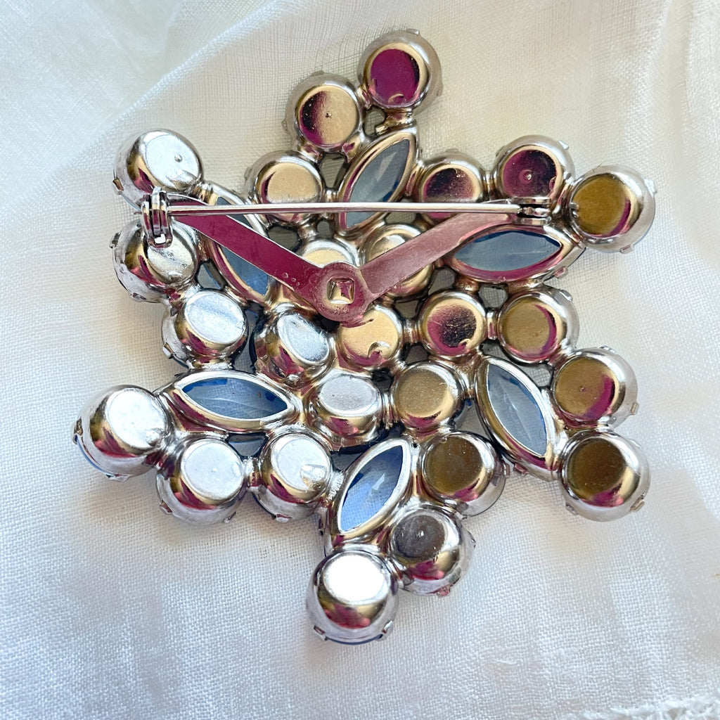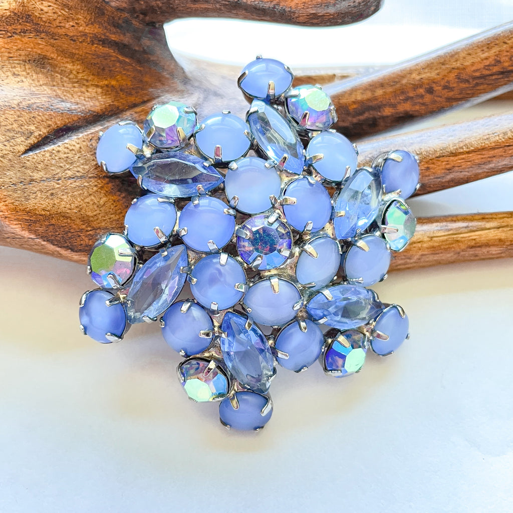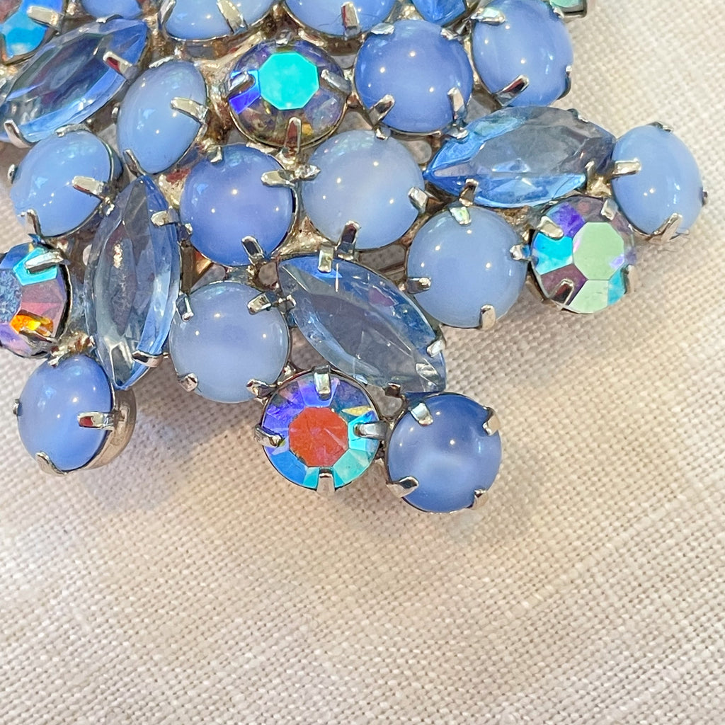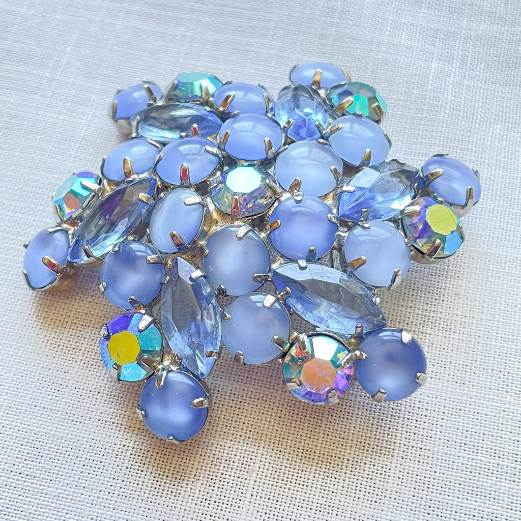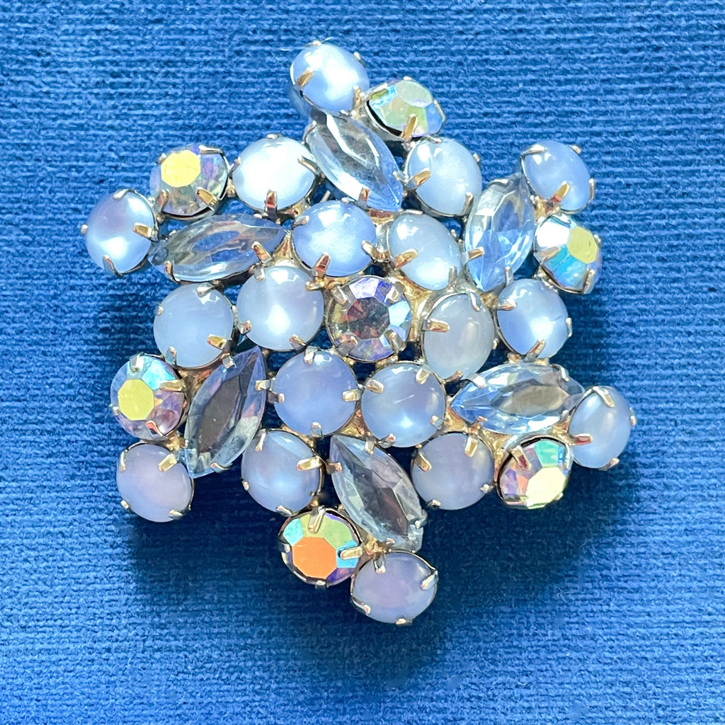 Lovely blue moonglow moonstone stones, aurora borealis & marquis rhinestones, in a prong setting.