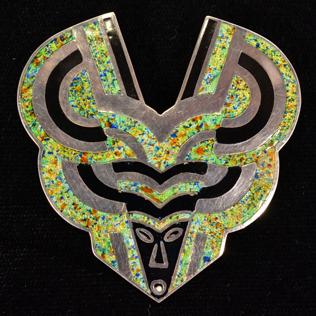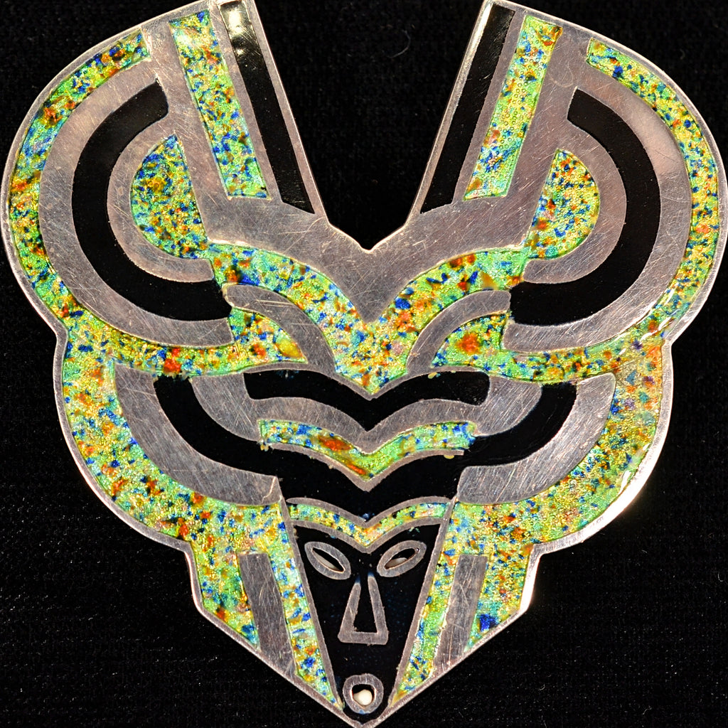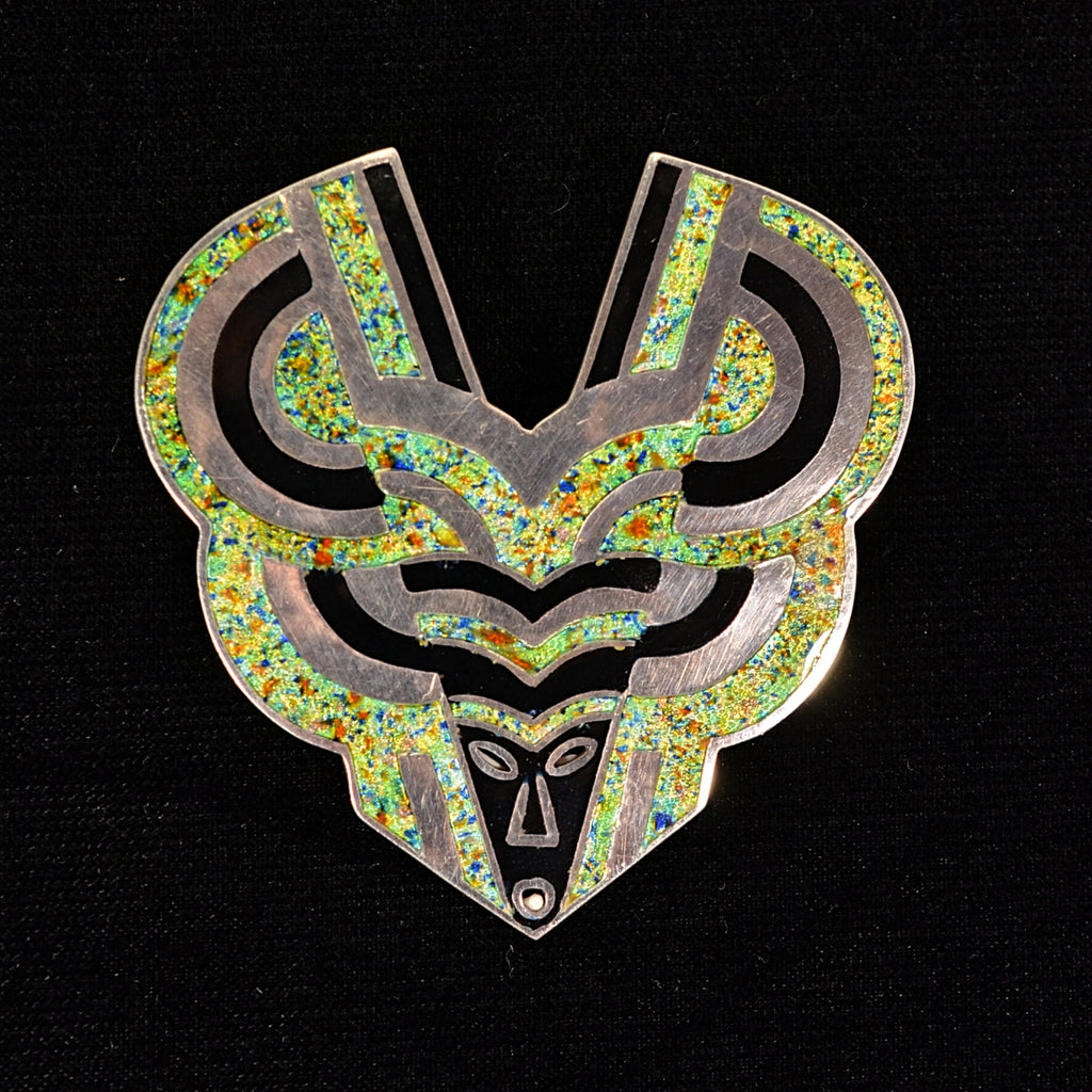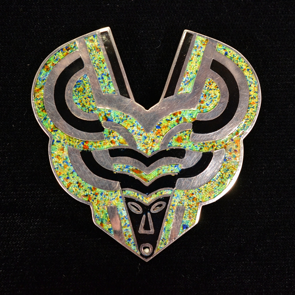 The design is champleve style enamel & sterling silver.