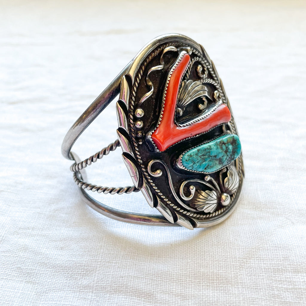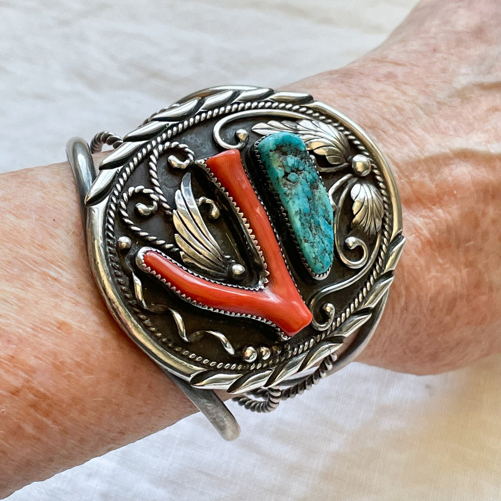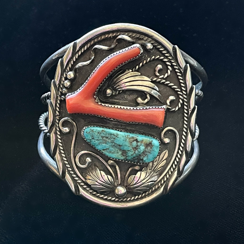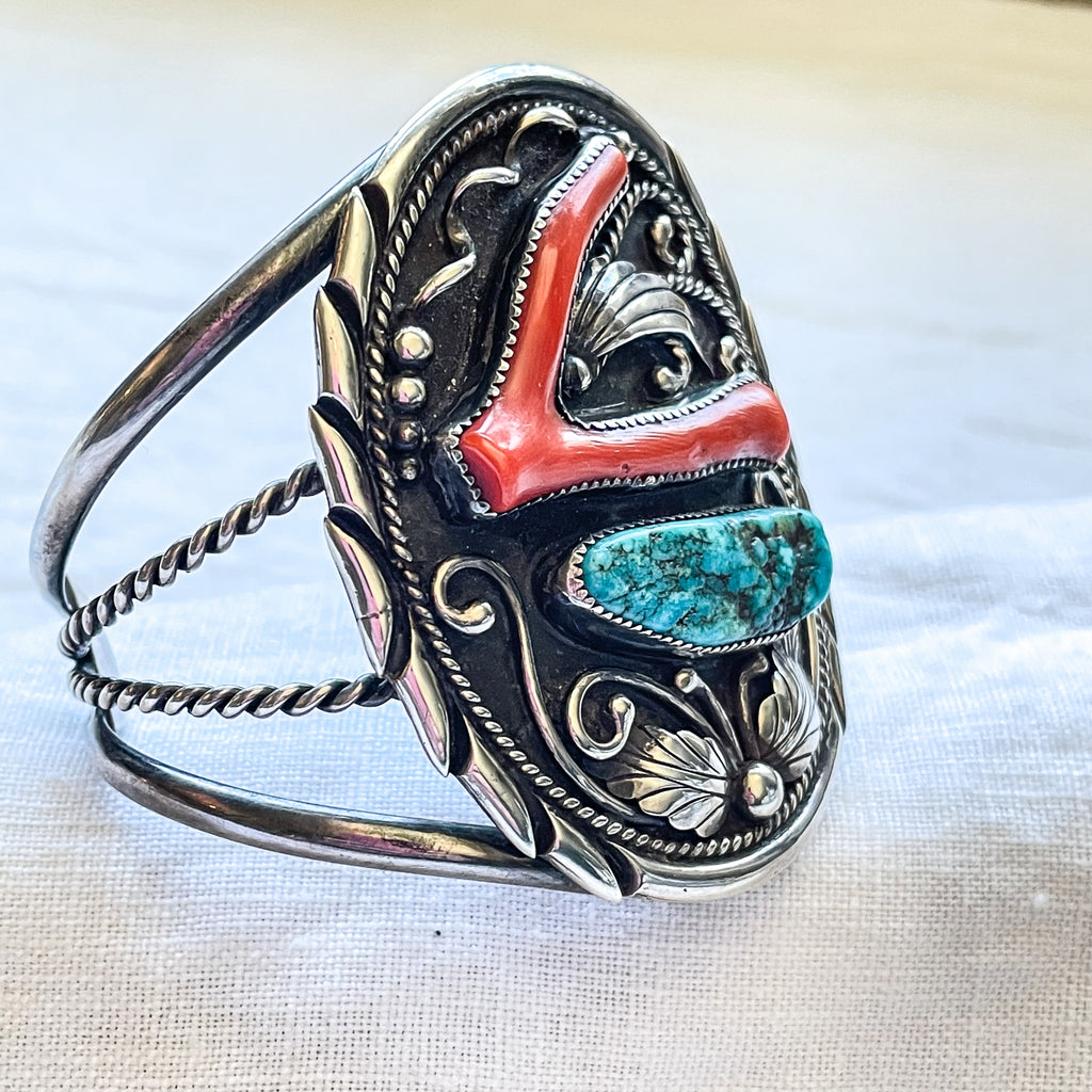 Beautiful vintage sterling silver, coral turquoise cuff bracelet.