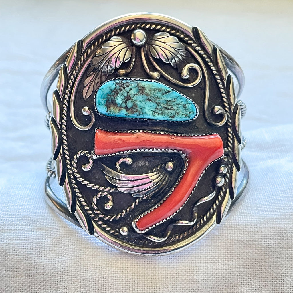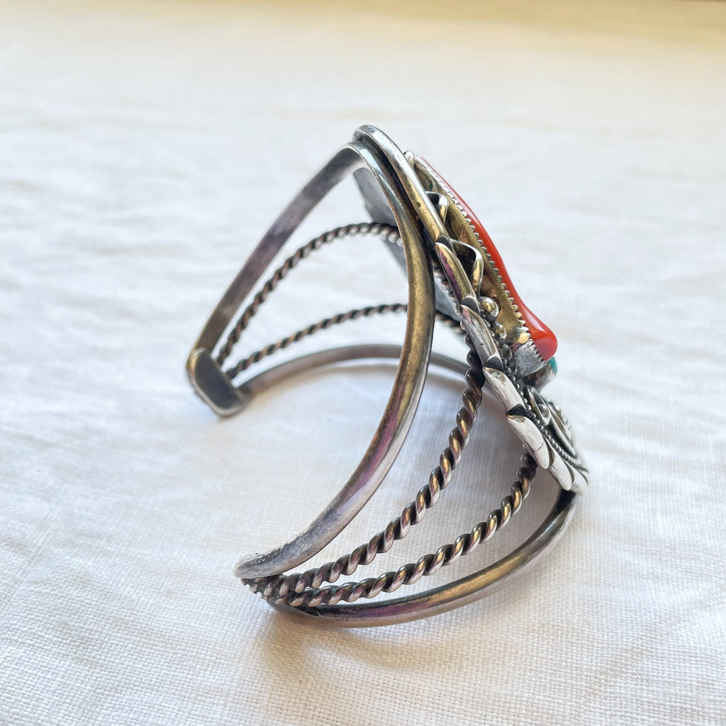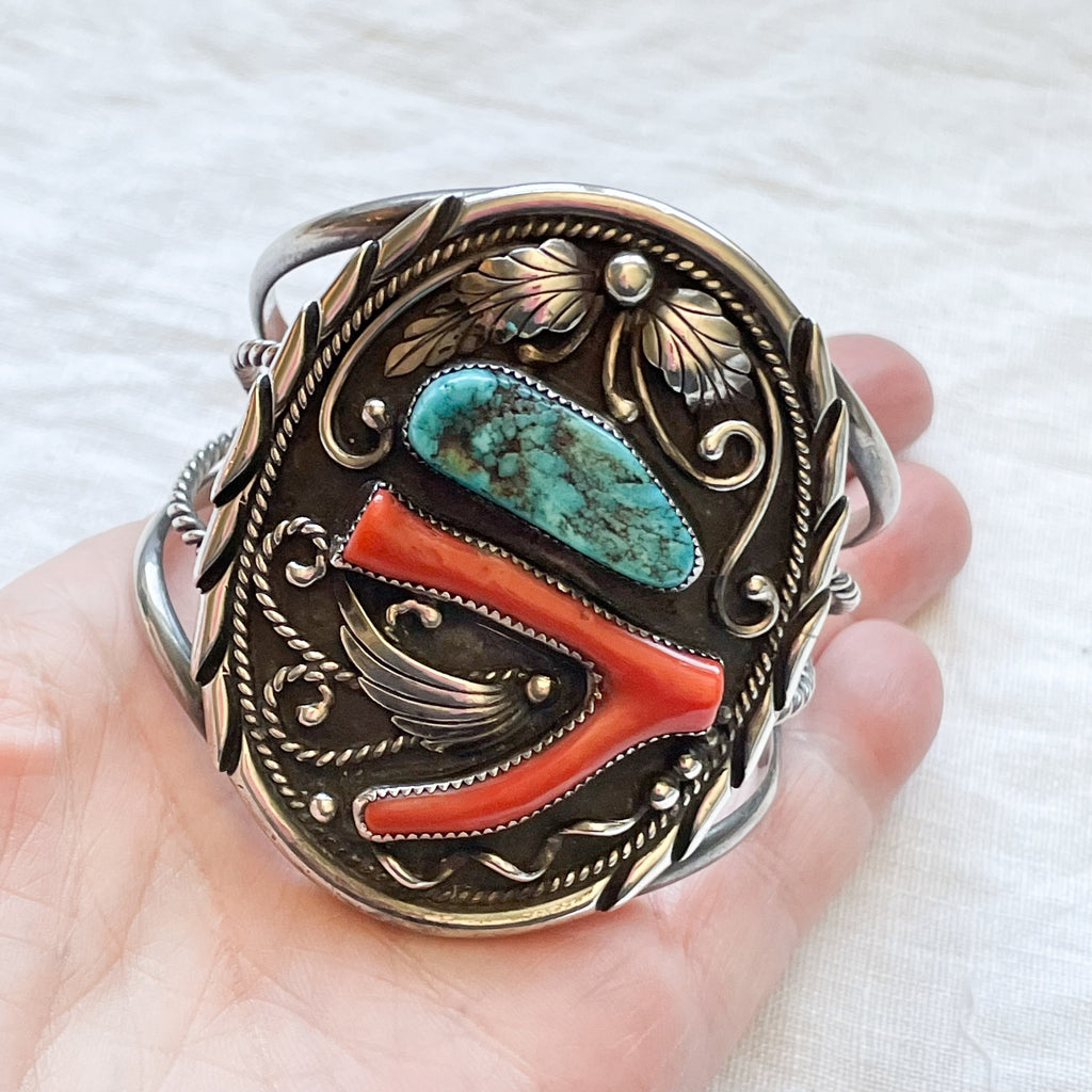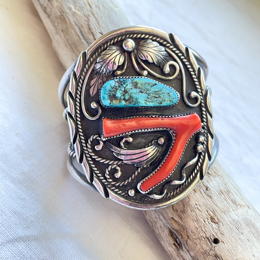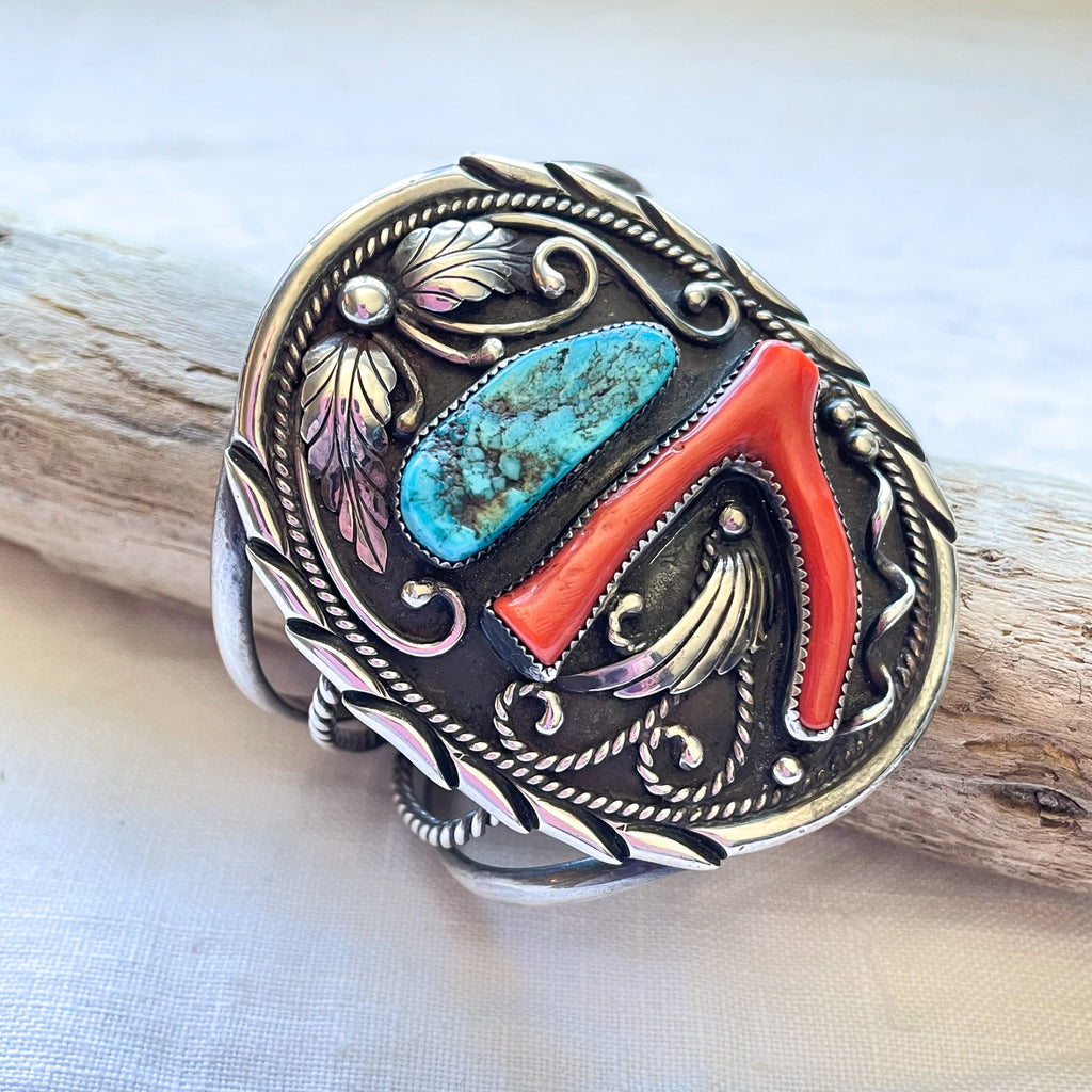 Beautiful vintage sterling silver, coral turquoise cuff bracelet.