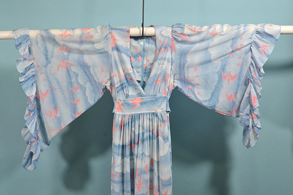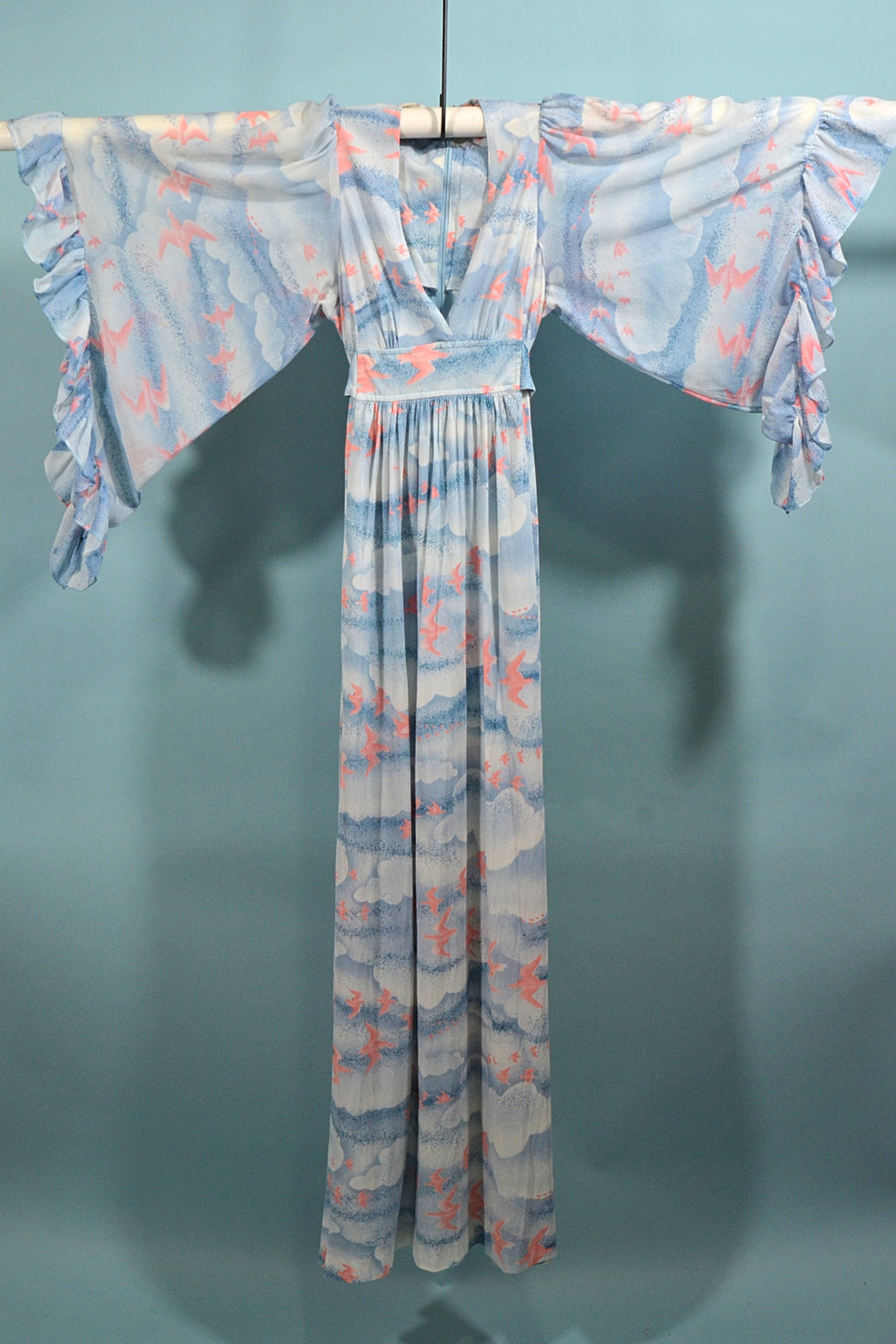 Stunning vintage beauty with full angel sleeves with ruffles.