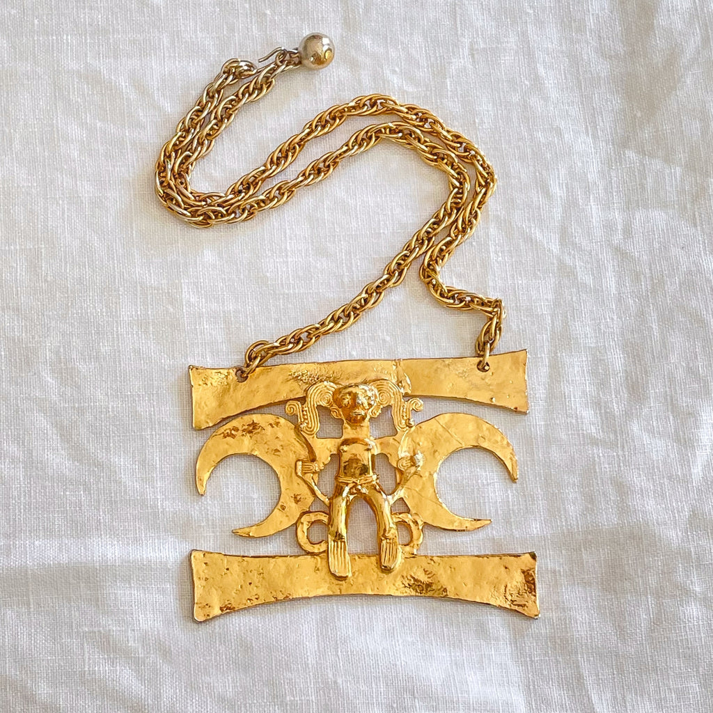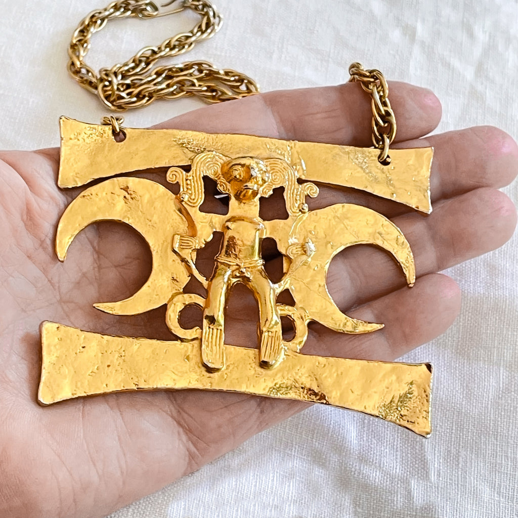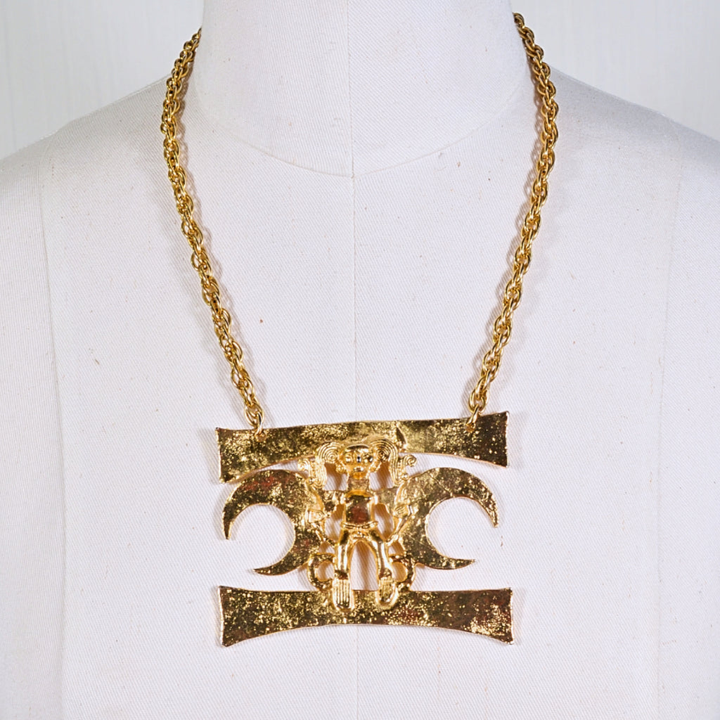 Beautiful rich gold tone large Mayan style pendant necklace.