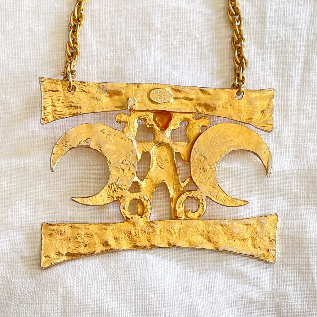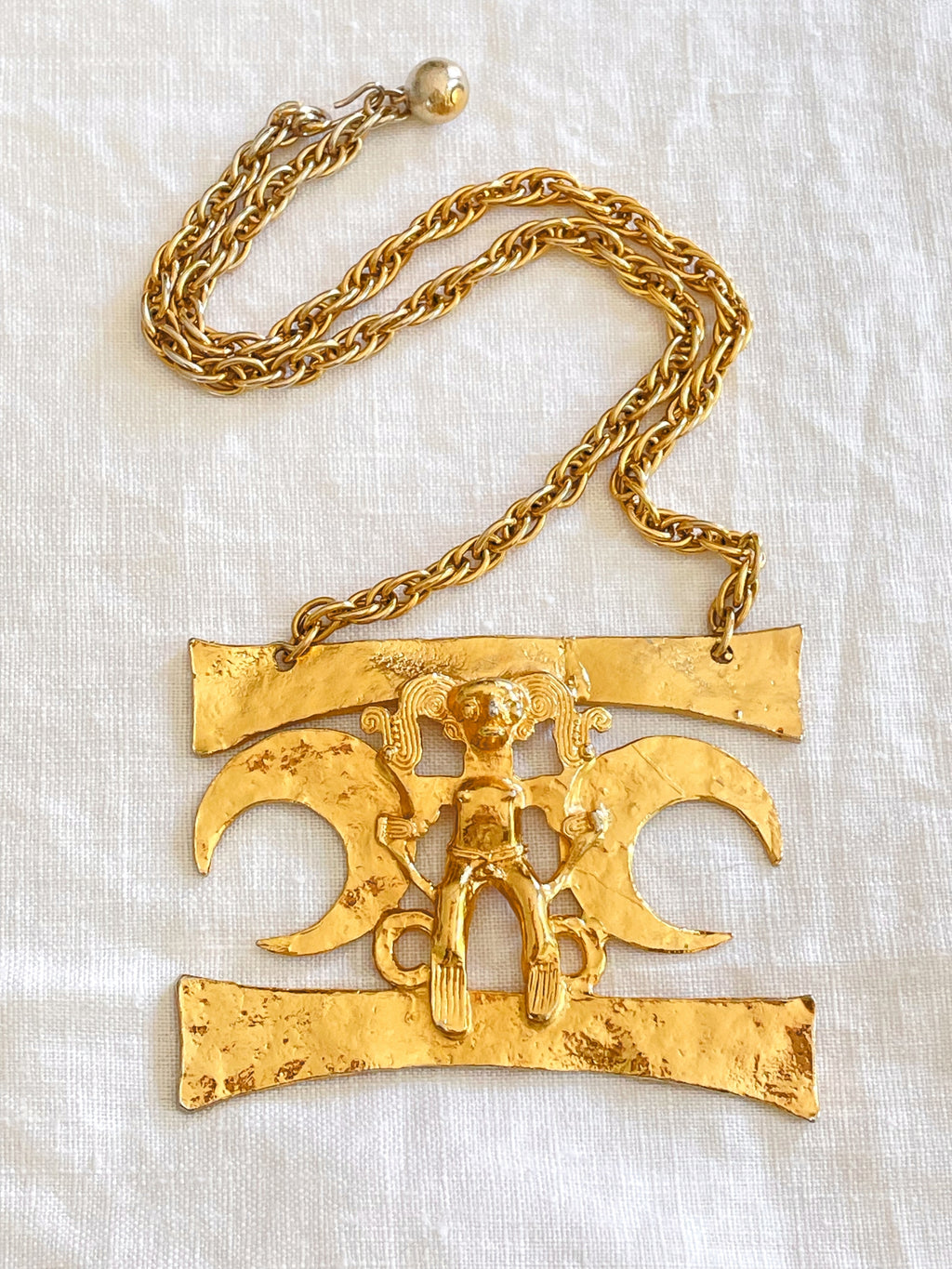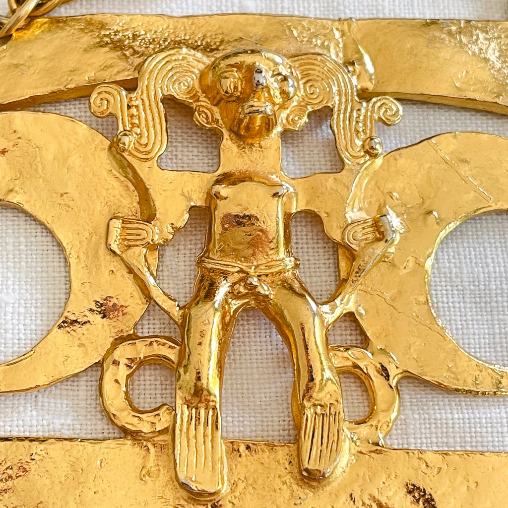 Beautiful rich gold tone large Mayan style pendant necklace.