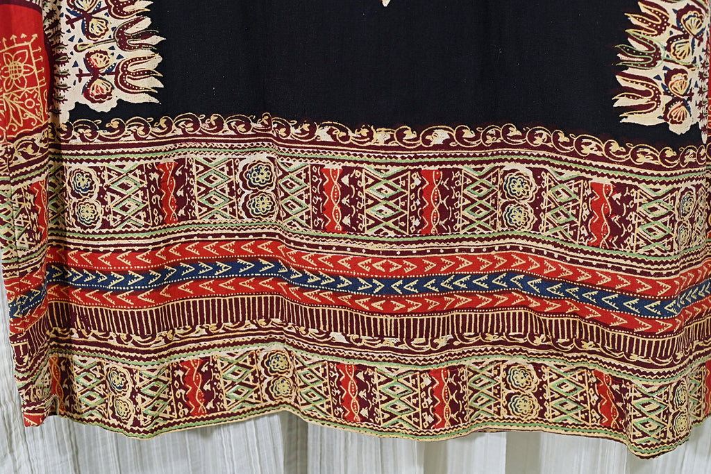 Deep navy-blue ground with vivid intricate patterns printed on the front and back.