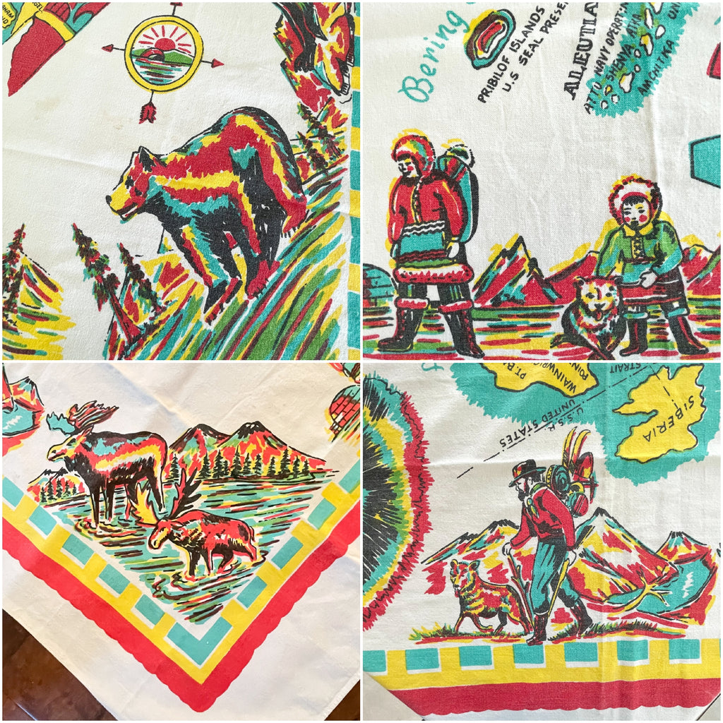 Vintage Alaska souvenir tablecloth with map including cities and interesting tourist sights.