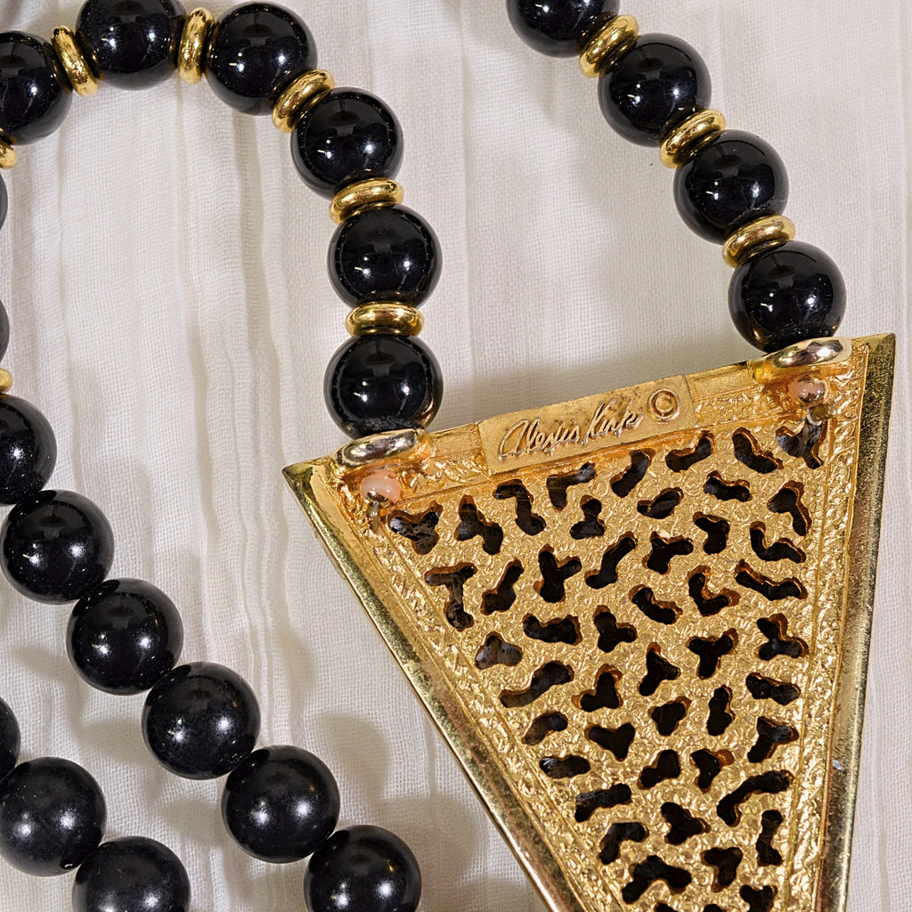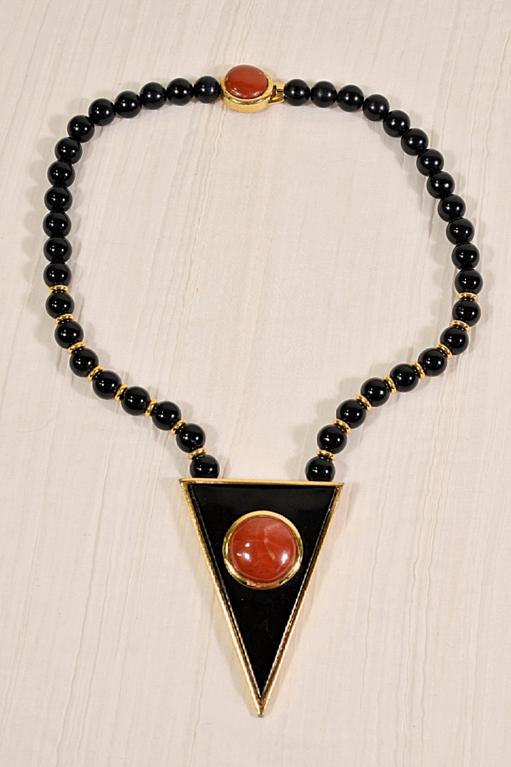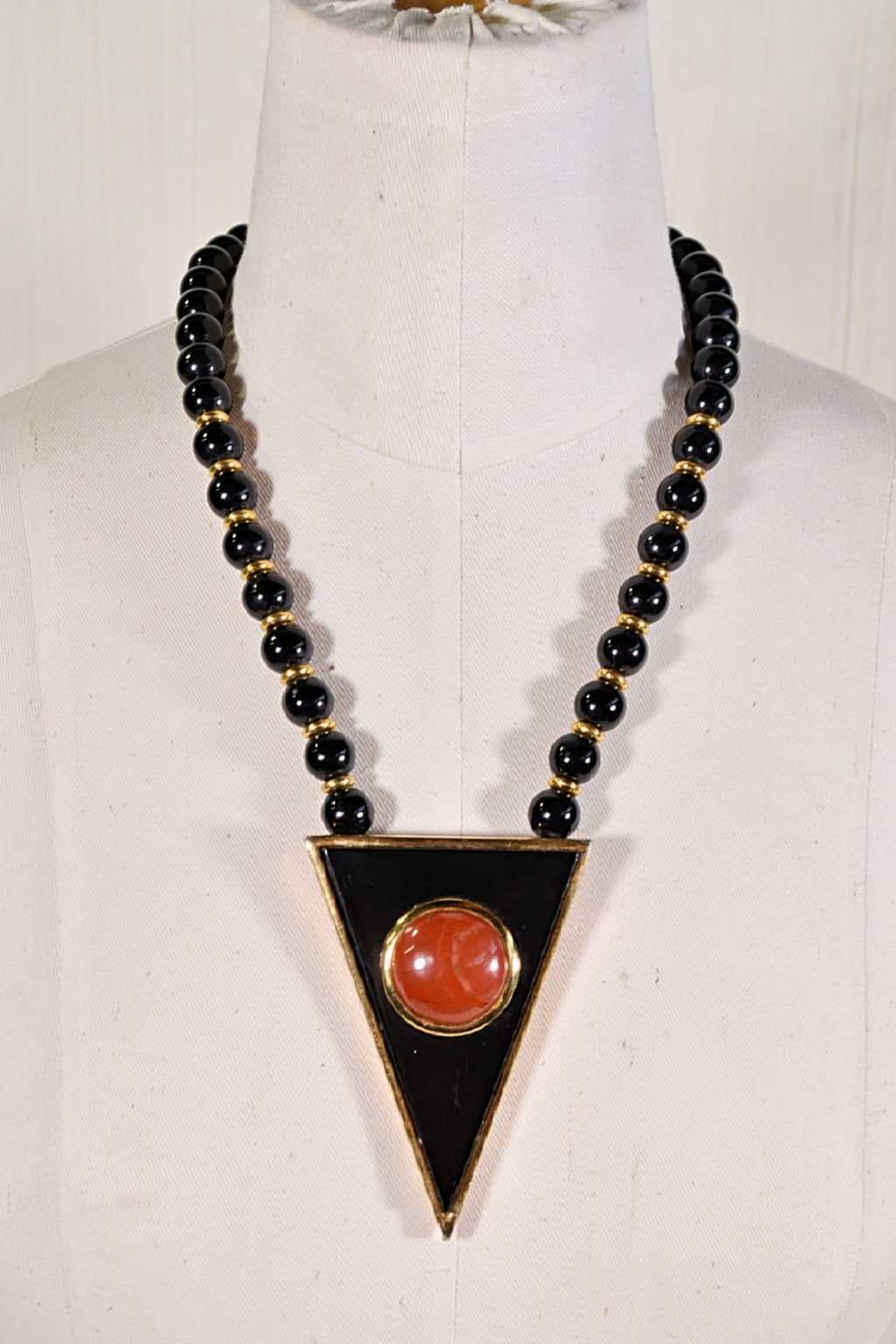 Vintage 80s triangle shape Avant Garde Modernist pendant necklace. Faux stones and gold-tone finish. 80s Deco style. A fun statement pendant necklace.