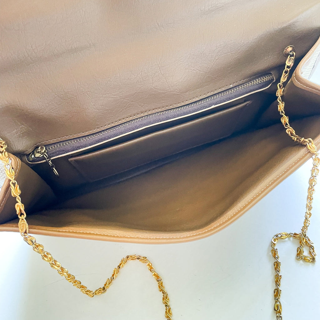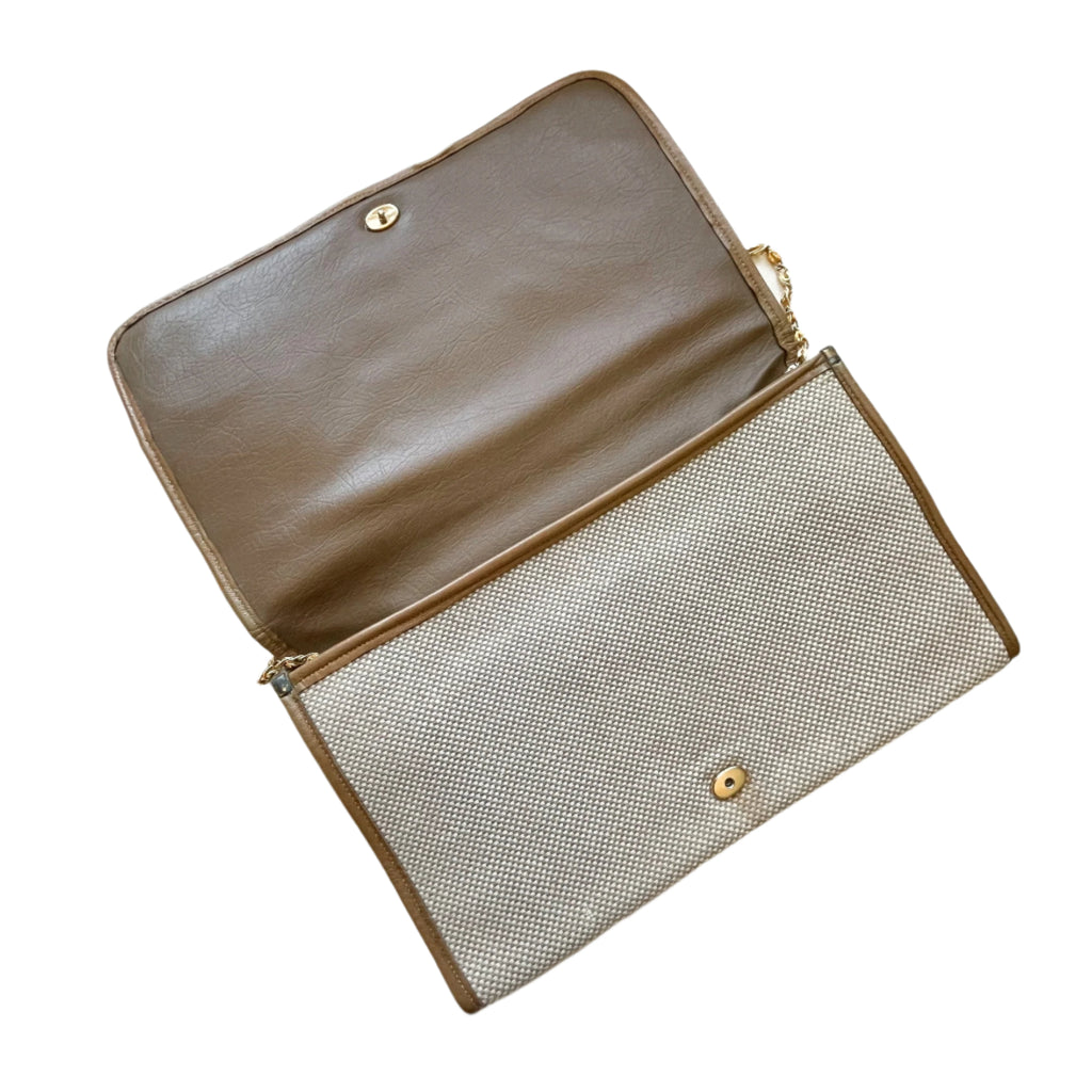 Edged in leather, lined in vinyl, thin metal shoulder strap.