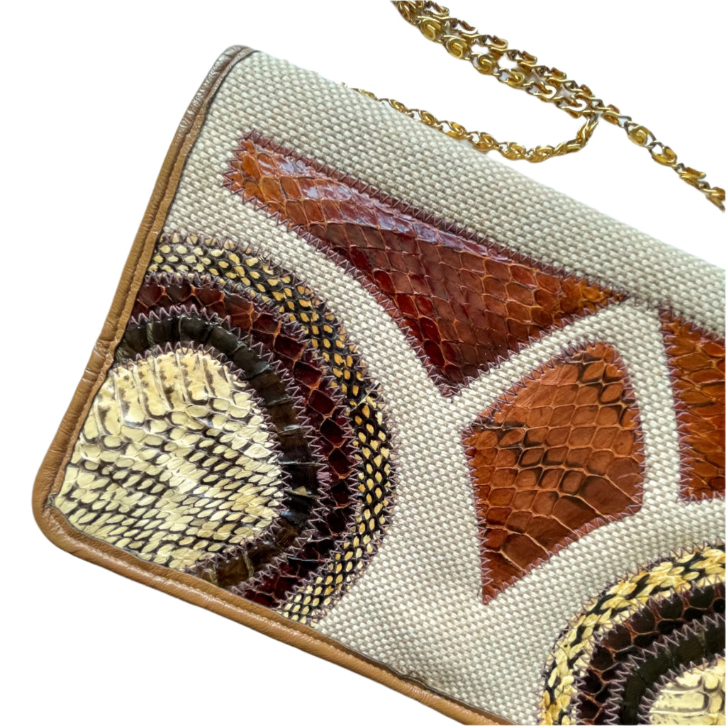 Vintage cloth clutch handbag with applique snakeskin on the front.