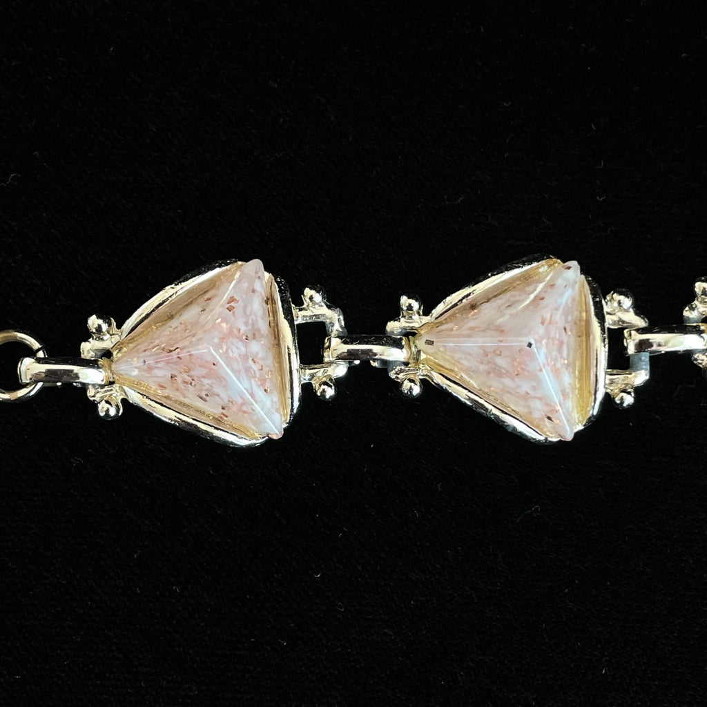 Gold tone links, raised triangle shaped Lucite cream & pale pink with copper confetti stones.