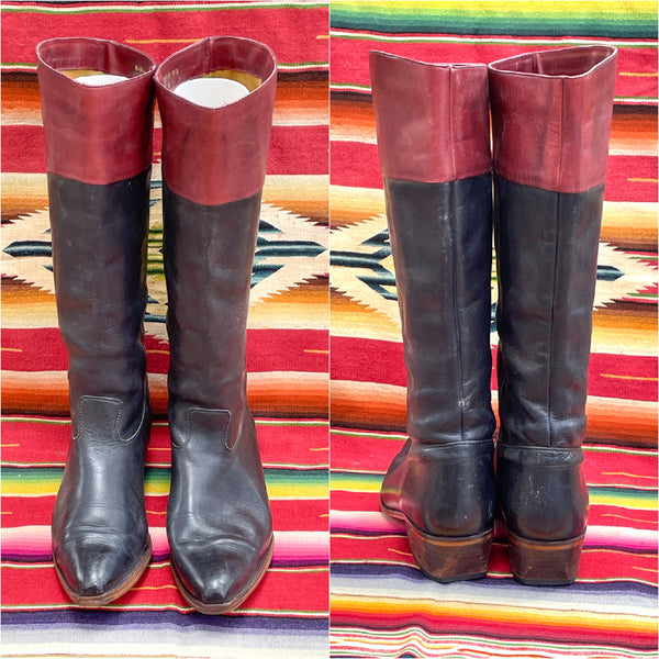 SOLD Vintage 80s Leather Black/Burgundy Leather Boots, Equestrian Style Pull On Boots 9