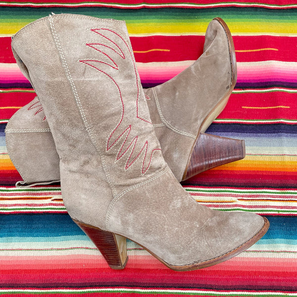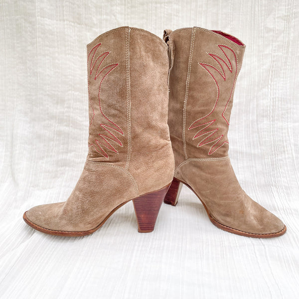SOLD Vintage 80s Womens Western Boots, Beige Suede Made in Brazil 7 1/2