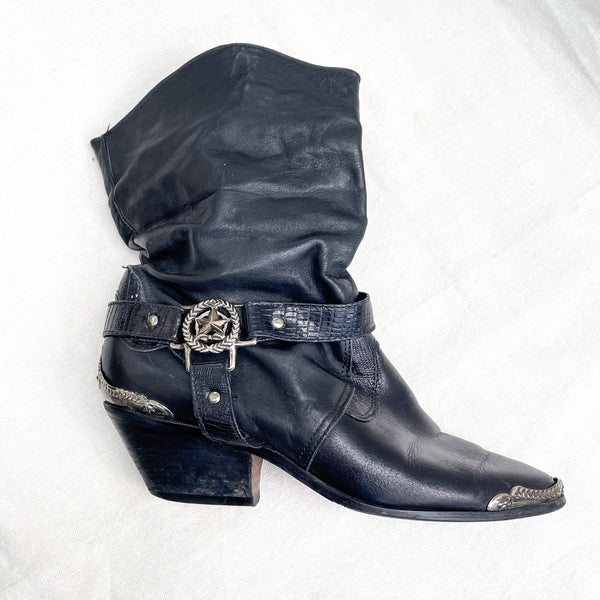 SOLD Vintage 80s Slouchy Ankle Boots, Star Toe/Heel Caps + Belts, Cowboy Booties 7M