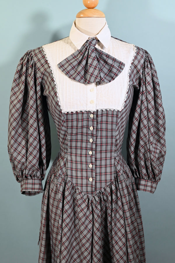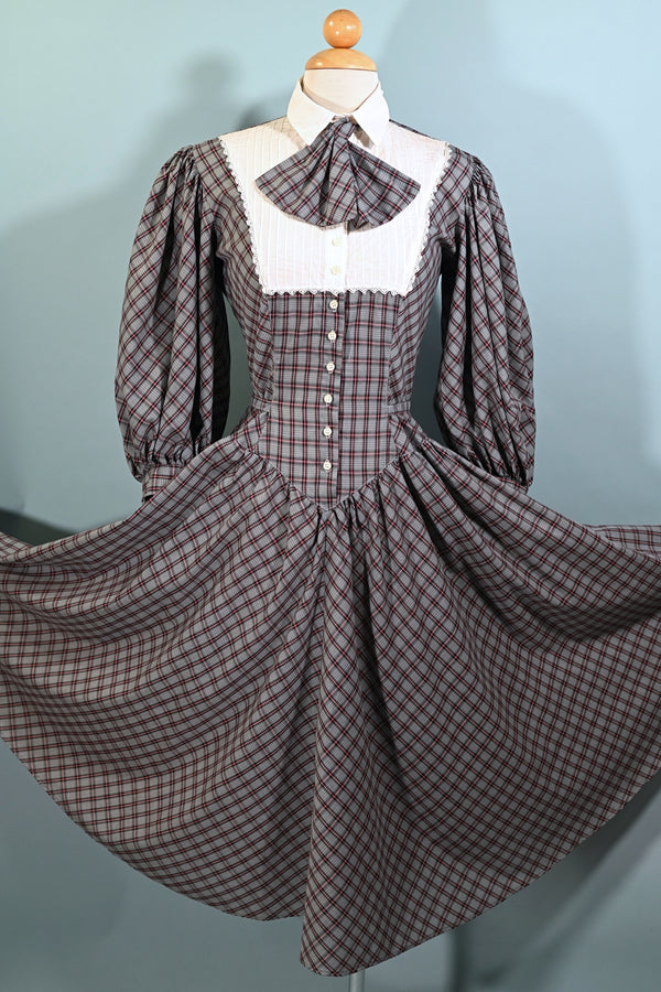 SOLD Vintage Foxy Lady Plaid Prairie Dress, Dark Academia, Victorian Revival Dress S