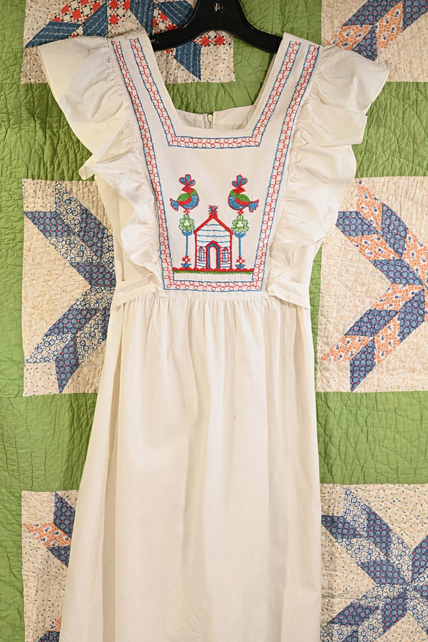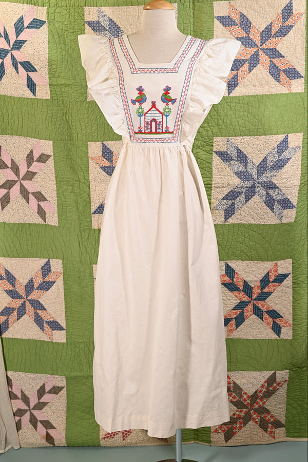 SOLD Vintage Embroidered Pinafore Maxi Dress, Cottagecore Ruffled Dress