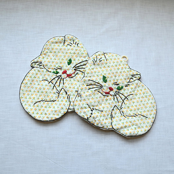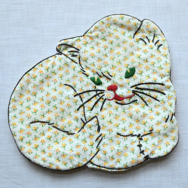 SOLD Vintage Embroidered Cat Pot Holders (2), Calico Print