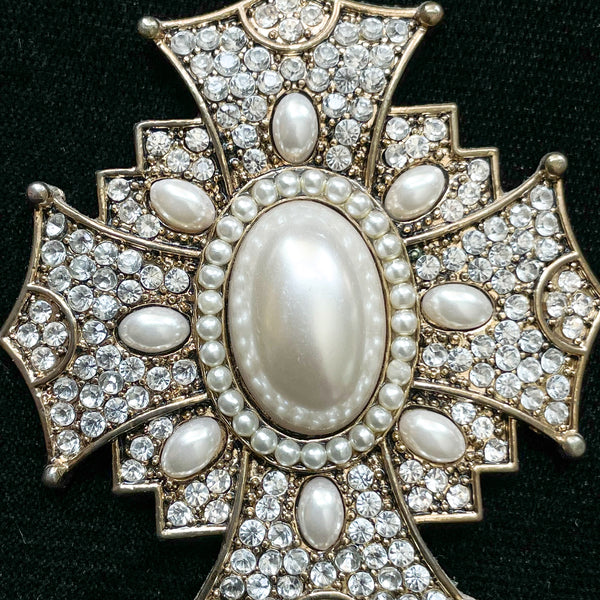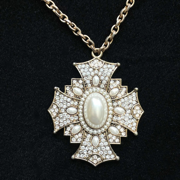 SOLD Vintage Faux Pearl Pendant Necklace, Maltese Cross Statement Necklace, Renaissance Revival