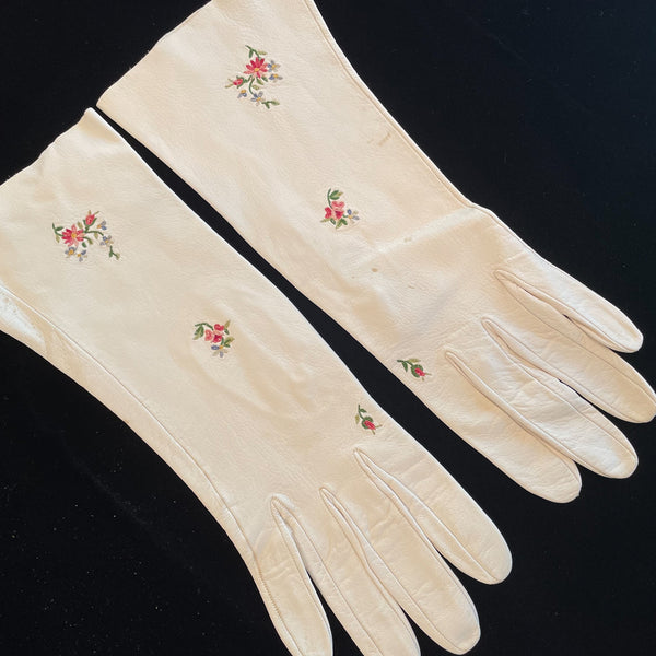 SOLD Vintage Embroidered White Kid Leather Gloves, SZ 7